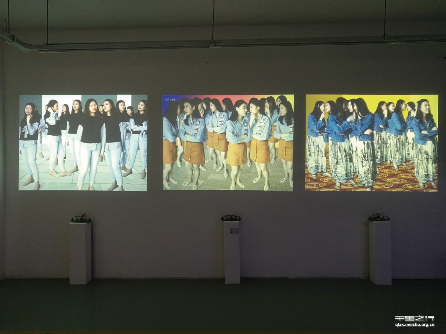 社会群体对个人的集中关注称之为社会凝视。当人们察觉到周围有人对自己的注视时,这种注视会给自己带来很大的压力和精神紧张,甚至有一种隐隐的暴力感。在被注视的过程中,人们的心理活动时常反复,特别是群体同时注视瞬间,会让自己非常想走开或逃避。我试图对这种被别人观察或者注视所带来的紧张气氛做一个形容或者诠释。于是,我在创作这个作品时,运用互动装置切换画面来进行表达。当作品前无观众时,画面中的人交头接耳;而当有人经过或停留时,画面中的人则凝视观众。