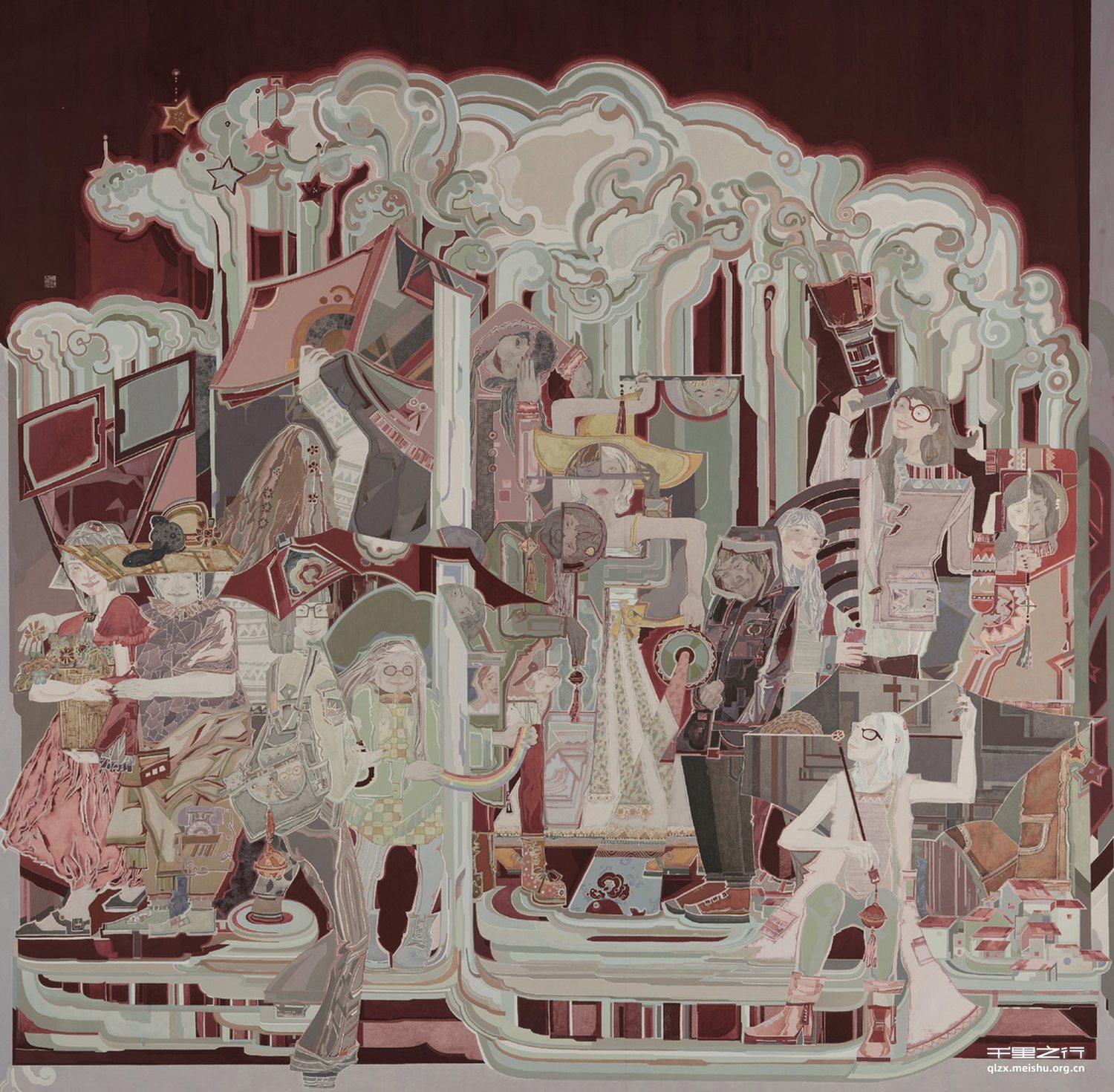 本作品追求平面拼接叠加的视觉效果,脱离完全写实的人物造型,以工笔重彩的形式,研习壁画层叠厚重的赋色手法和传统工笔画水色相撞晕染的形式,展现出厚薄结合、层次多变、色彩丰富的活泼面貌。我希望以明丽多彩的画面引人驻足回望,探寻画面中暗藏的彩蛋。