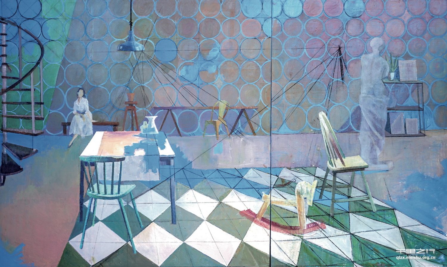 画画即是幻术,目之所及皆是一片虚空。五色按规律排列组合,构造出一片巨大的虚拟空间。我想尝试通过纯粹到元素的方式,以抽象表达真实,这是绘画的魅力,更是想象力的魅力,正因为有你们的观看,观众和画面的互动,平面才得以成为空间。