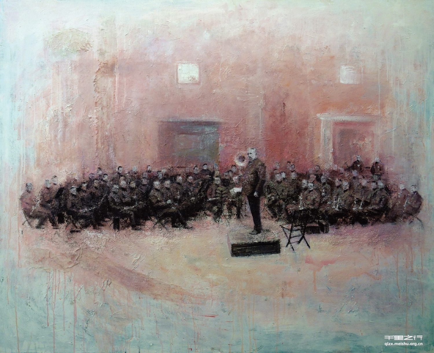 王洁的毕业创作素材来源于二战前后的黑白照片,在创作中她没有拘泥于照片提供的具体形象和元素,着重把握照片的气氛,强化主观感受,对图像元素进行了大量的主观处理。在作品《诉音》中,她让整个画面笼罩在一团粉红的氛围中,有种音乐旋律共振产生的轰鸣感,松动的笔触表现了音乐旋律在空气中颤动的感觉,温暖柔和。