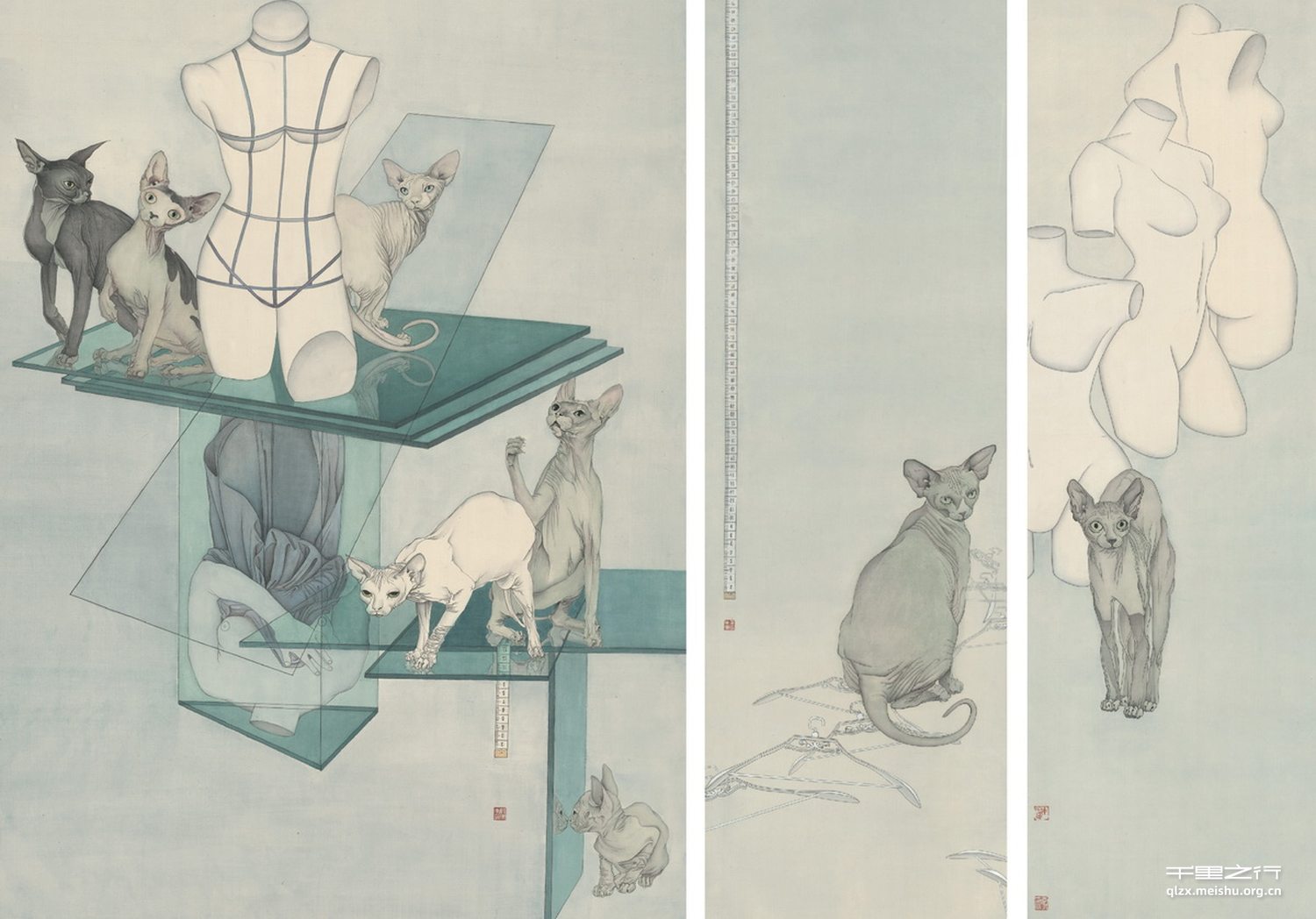《新衣》这组创作运用的是传统的工笔绘画技巧,即勾线、背衬、分染、统染等,画面主体是裸露的模特台、斯芬克斯无毛猫以及量体裁衣的皮尺。题目取自安徒生童话《皇帝的新衣》,表达了对于裸露与伪装、本质与皮相以及客观衡量标准的思考。