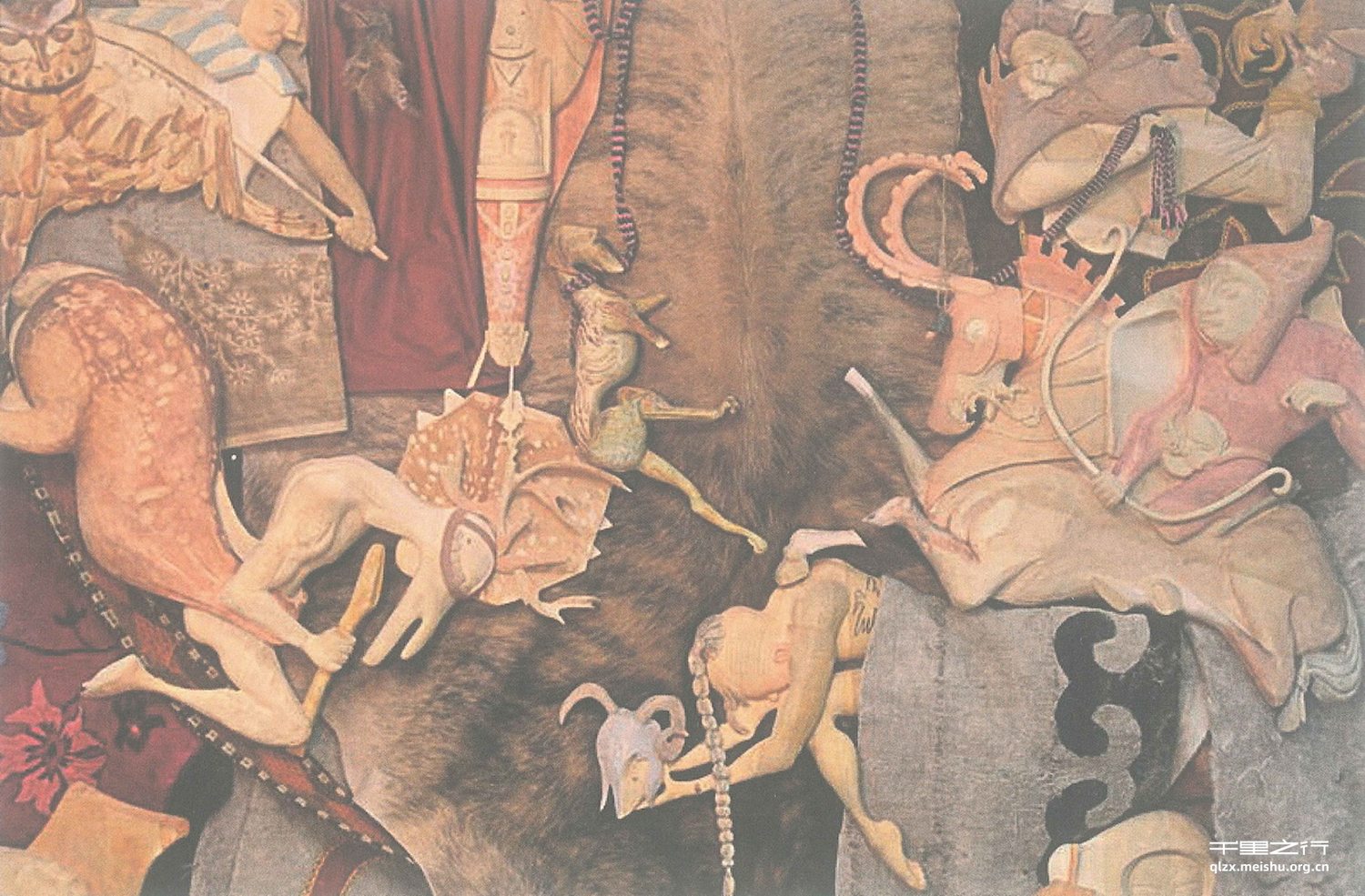 马合江作为少数民族的学生,对民族传统形象非常敏感,此次毕业创作,马合江就是通过挖掘民族传统形象获得了灵感,同时他以木雕、毡和皮等多种有民族特色的材料,创作出作品《阿尔泰墓》,在形式上有很独特的个人语言和民族特色。壁画系的教学对材质和媒介的选择是十分丰富和包容的,壁画系这种开放的教学和第二工作室对当代壁画公共性的重视,造就了很多思维活跃的学生,使他们在进入社会,面临各种创作业务时能沉着冷静地面对各种问题,能逬发出各种奇思妙想和奇特的解决方案,从这方面来说,他的这件作品无疑是很成功的。希望马合江同学在未来的创作中,能继续发挥民族特色,发挥创造力,奏出这个民族和时代的强音,赢得未来,臝得自己。