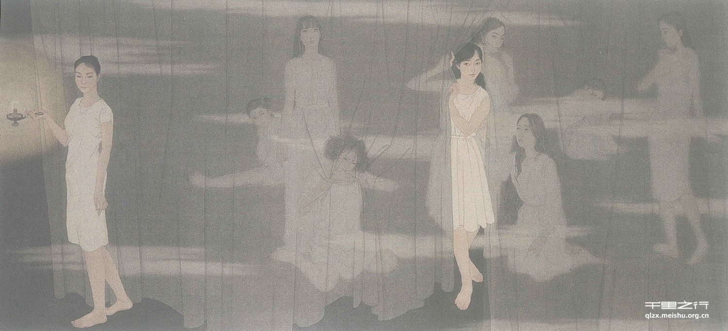 戴琦格的作品以绢本工笔的方式,以墨色的黑白层次间的变化塑造出人物丰富的内心世界,以纱帘幔帐巧妙分割画面来表达外部环境与自身之间的关系,整幅作品造型严谨,刻画深入,能够较好地把握人物的内涵。作品中没有世俗的脂粉矫饰,画面给人一种平静之余的深邃感。望该生继续在造形意识上有更进一步的探索,走得更远。