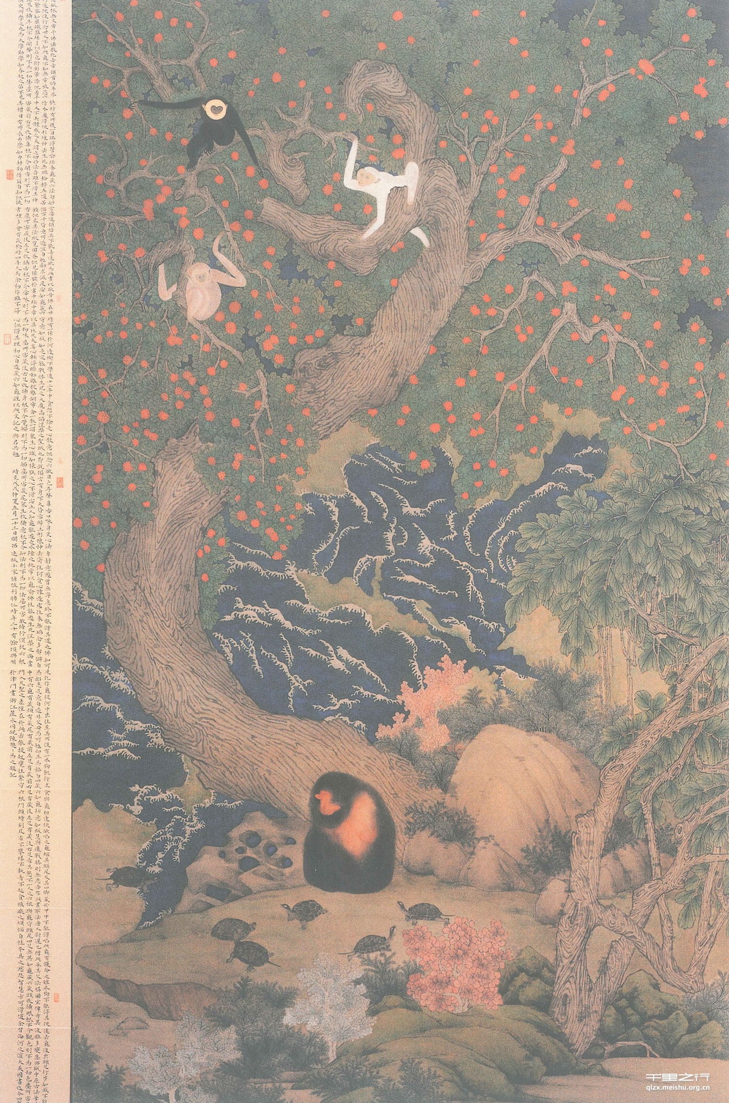 该作品是佛教题材绘画,构图宏伟奇异、复杂多变,线条如屈铁盘丝,多以石色敷彩晕染,沉着浓重,平中不失体感之美,谓之凹凸法。但以猿猴比凡夫妄心,谓众生心如猿猴之心,不得安止。画中有六龟,其态不一,人之六根与龟之头、尾、四足无异,人守之如龟藏六。