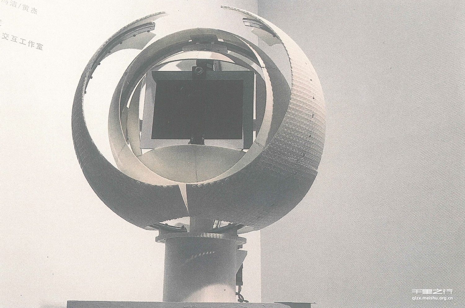 我的这个作品是一个可以和人互动的艺术装置,它可以自动捕捉现在装置前面的人的位置,进行观看角度的调整,并且可以把观测者的形象用线的形式画出来。它的外面两层球体是可以缓缓转动的,这样就会有一个概率出现,就是每个人呈现的图像清晰度都是不同的。我们的作品主要是想说明,在科技飞速发展的今天,唯物主义和唯心主义的界限到底在哪里这样一个问题。近代量子力学的几个实验都是违背常规物理现象的,违背相对论的,比如说量子通信,它是用超光速传递信息的,比如说我们观测一个粒子进行试验和不观测进行试验,得到的结果是两种情况,也就是说人们观察的介入,是会影响到粒子存在的状态的(这是我个人的猜想)。也就是说,人的行为是会影响物质世界的组成的,也就是说我们的《周易》、八卦、风水、穴位、中医等都是有可能真正存在的,只是就像量子力学一样目前不能解释它的原理。也就是说我们古代的一些神学和神话传说在未来有可能是超级科学。我们的这个装置,就是象征着一个小小的粒子,人们观察它的时候它会给人一个反馈。我们用它来传达这个想法。
