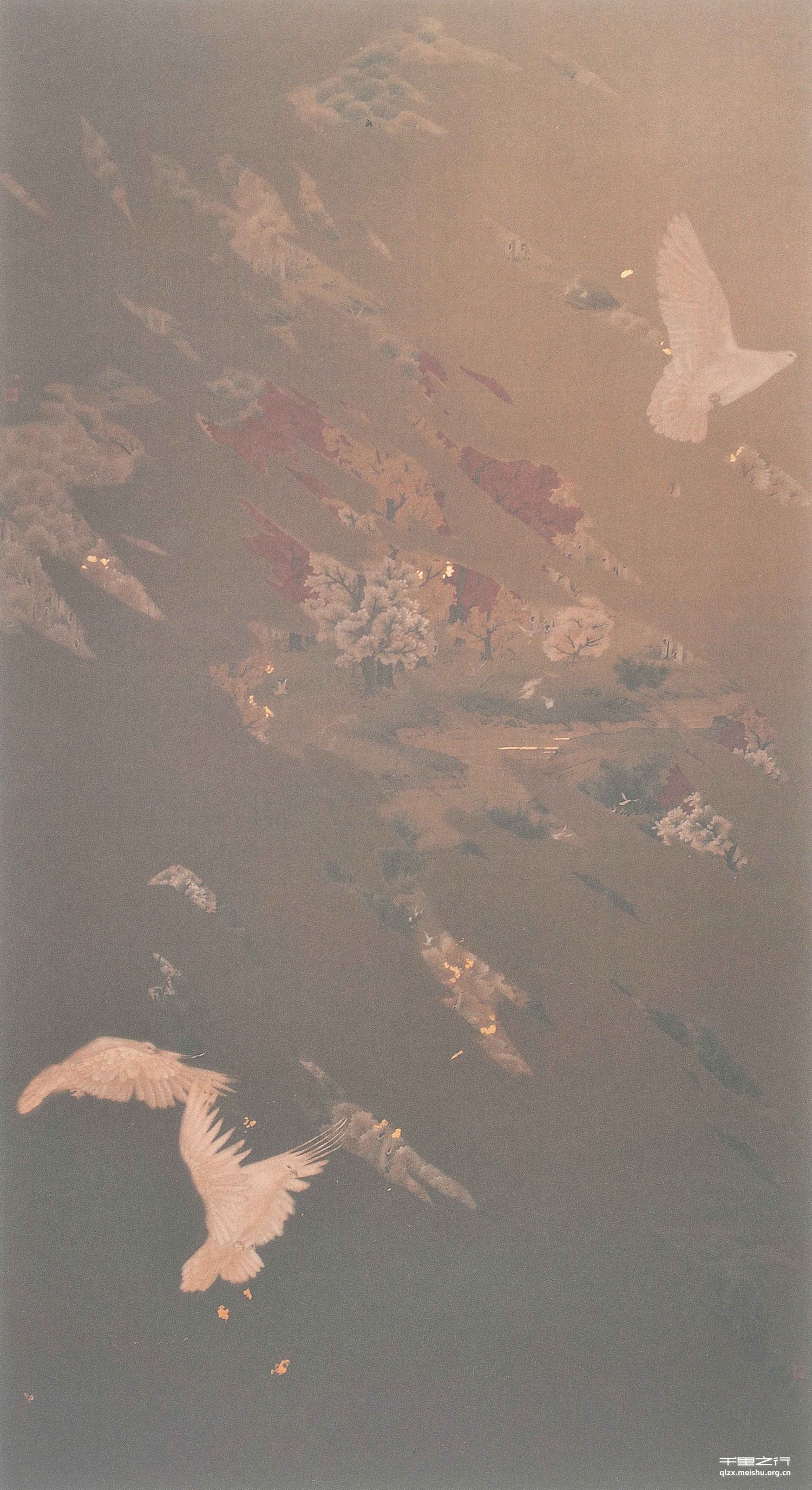 盘旋的飞鸟,忽而于眼前,忽而又不见,是否穿过了时空的间隙,到达了那五代的《丹枫呦鹿图》中的境地?翔于云表,系于流风,忽明忽暗间闪现的是灿若云霞的秋林碎片,待白羽落下,一切如梦,了然无痕。天际处,人不知,道不清何处曾见,渚清沙白,只余一缕清风,几片闲云。