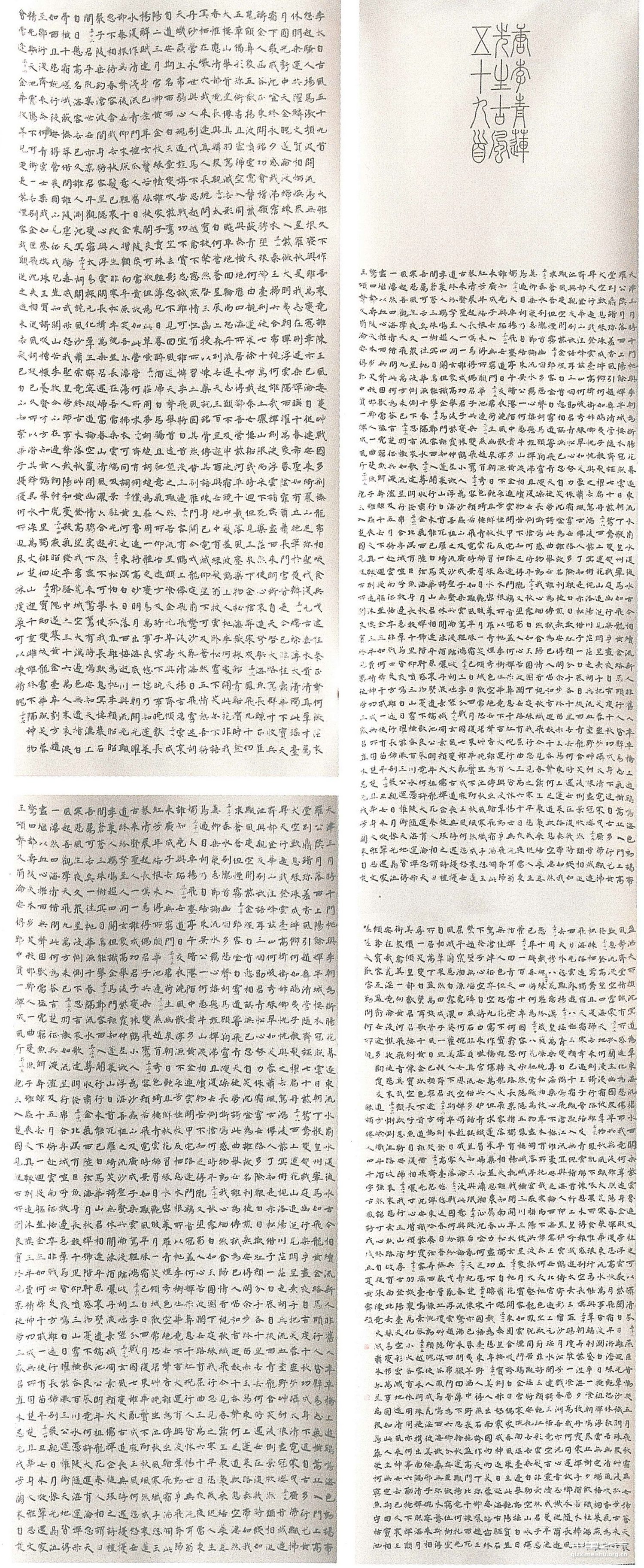 盛唐人,禅也;太白则仙也。言出天地外,思出鬼神表,非世间语者。李白作《古风》五十九首,始则阐文章之变,继论干载风尘,而沉叹自哀,所以问道求仙、抒发性灵,通篇浩荡衍漾。笔者深感其为世间真赤子,随其性情所至,录此诗篇。本作以小篆“唐李青莲先生古风五十九首”十二字作小矩阵题头居中,以揩书正文及落款近四干字作大矩阵于下,裱成通景轴三条,欲再现盛唐气象与淳雅古风。