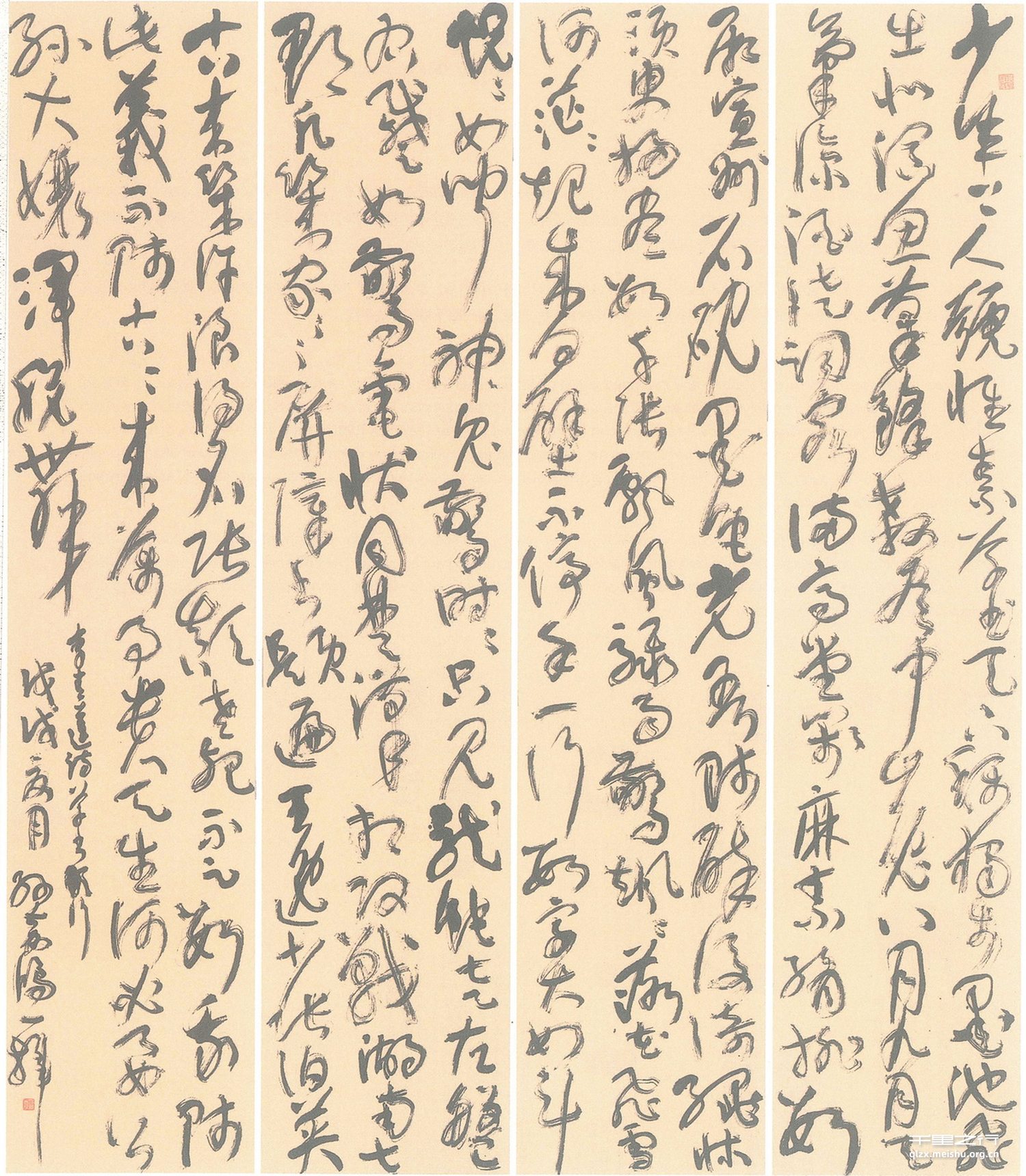 李白的《草书歌行》是我极喜欢的诗,用草书书写此诗,与内容暗合。我平时练字以草书和小揩为主。草书较多临习《书谱》《十七帖》、王觉斯及于右任先生的作品,也用力于黄山谷的《廉颇蔺相如列传》。草书的创作,应以行云流水的感觉为主,不刻意模仿,更不应舍本逐末,追求过多起收笔细节。不是将马腿装到驴肚子上,而是熔铸为一体,处处不见临摹痕迹,处处又暗含古人意趣。