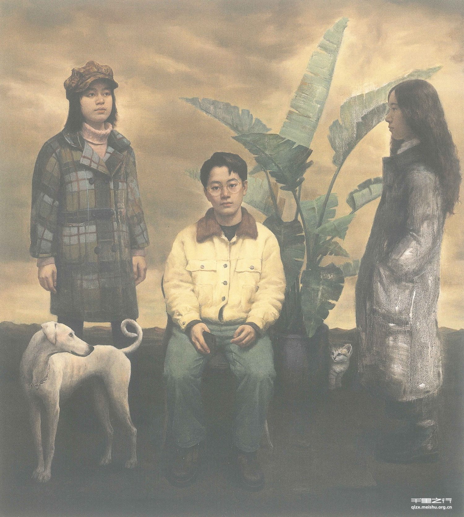 如何去挖掘和表现人物内心世界一直是子雄努力尝试的课题。她细腻敏感的内心同时又有着强烈的表达愿望,在这件作品中她以身边同学和朋友作为绘画的客体,以一种陌生的方式设置人物和场景,主观上弱化了色彩,以期达到一种混沌的状态来表达他对于现实生活的思考。画面具体而充分,作者的具象能力得到充分发挥,可贵之处也正是我们与现实的那一步之遥,这使我们置身于他的现实之外而体会到画面的感人之处。