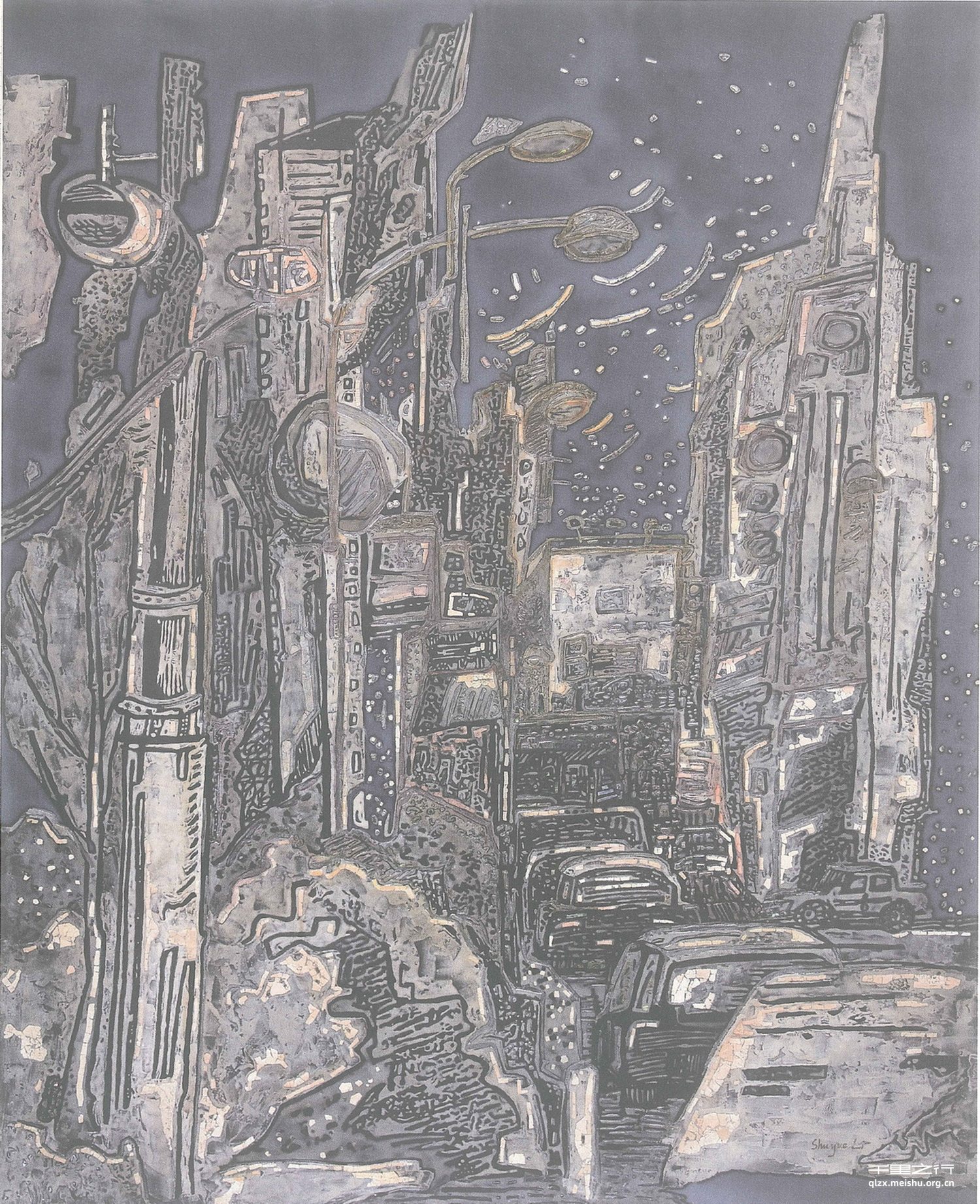 该作品是一套城市风景创作中的街道近景。画面中,城市高楼営立,车水马龙,天空中闪烁着星星.在现实中,生活匆忙的人穿梭都市里却无暇抬头去感受天空中闪烁而美妙的星辰。画的基调呈灰色,有种暮色将近的感觉,螺钿粒遍布其中,它的光泽恰好像天空中若隐若现的星,而画面中的暖黄点亮了这座“不夜星城”。我想要表达的是:无论生命是多么的短暂匆忙,也不要忘了其中最原始的感动。