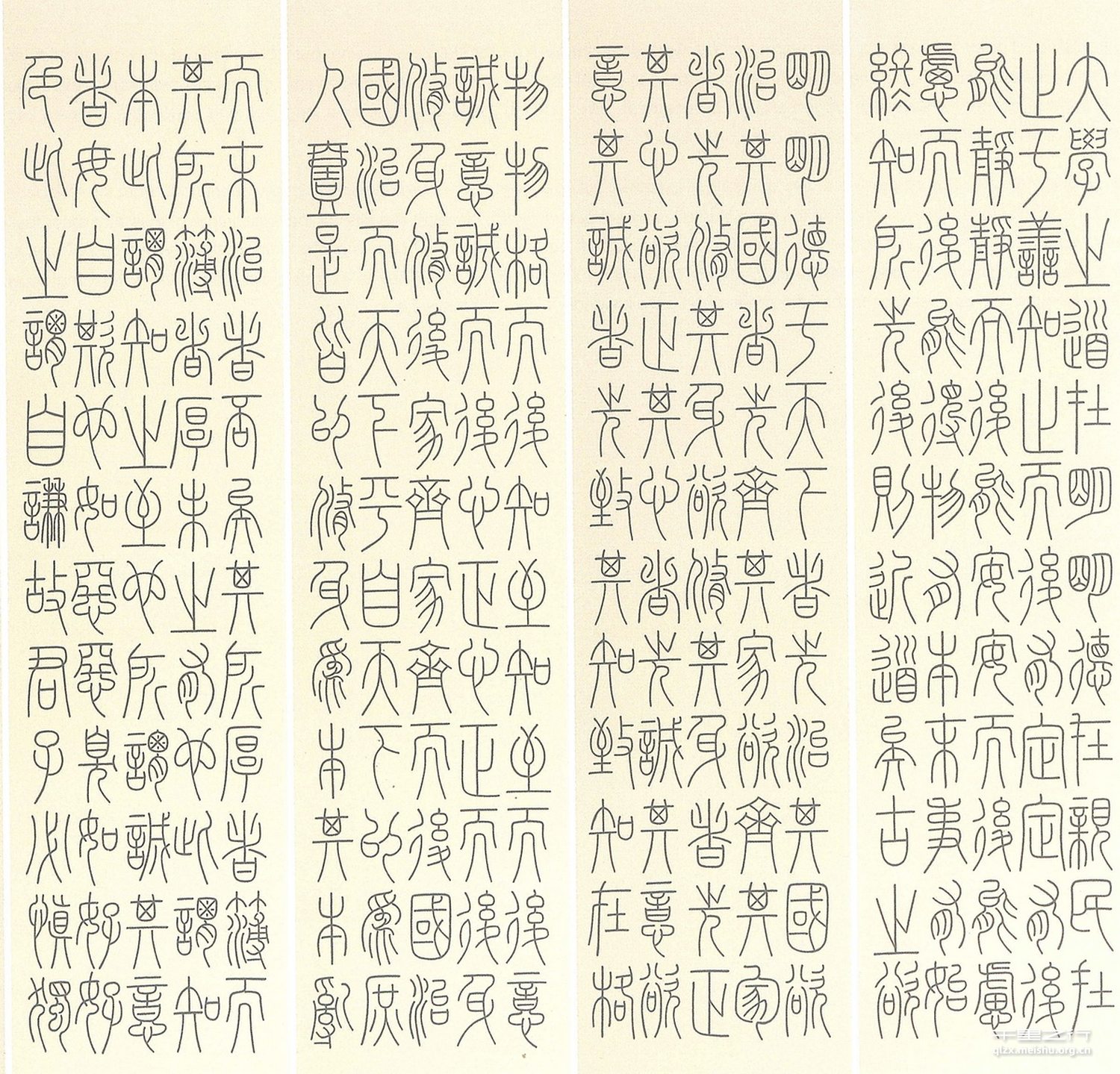 作此作品源于自身十分喜爰小篆,爰不释手。最初接触的小篆是李斯的《峄山碑》,从中感受到书法的严谨,其线条是在圆匀的笔致中凝结着敦厚的力量,滋润而不软沓,流畅而不浮滑。后来又临摹李阳冰《三坟记》,《三坟记》继承《峄山碑》筋骨笔法,线条遒劲平整。整幅作品的创作灵感来源于两者之间,取《峄山碑》的筋骨瘦劲、宽博大气,又吸取《三坟记》结体纵势而修长,整体雍容。