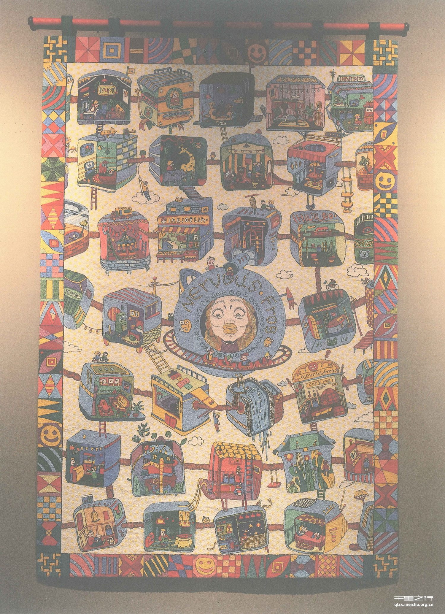 约翰?多恩曾说:“没有人是一座孤岛,可以自全。”在我的作品中有36个小房子,代表了36种多彩又不同的小世界,它们是相互羁绊的,同时也出现了很多富有童趣的意象,例如滑滑梯、秋干、跳房子等,展现了一个没有尔虞我诈、充满自由快乐的乌托邦,提醒着自己返璞归真、勿忘初心。作品中反复出现的“NERVOUSFROG”的标志是我创建的小小品牌,而这幅作品也是我对它未来发展的憧憬和期待。