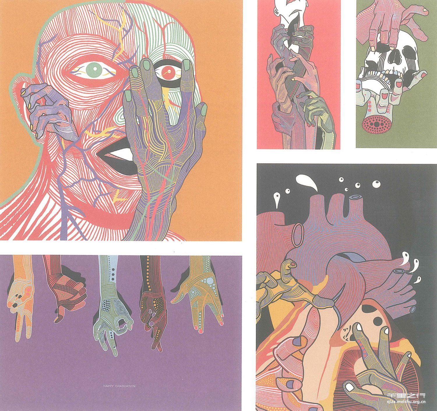 “异语”是指奇特的语言,作品运用了丝网印刷技术,利用丝网印刷中的特殊工艺植绒和厚板来突出某些人体部位的肌肉组织,使画面更加有质感和真实性。作品主要对人体构造进行创作,通过对头部、心脏和手的夸张、分解、组合等手法体现精神世界的反常态,注重作品隐含的精神态度,展现人无完人、金无足赤。