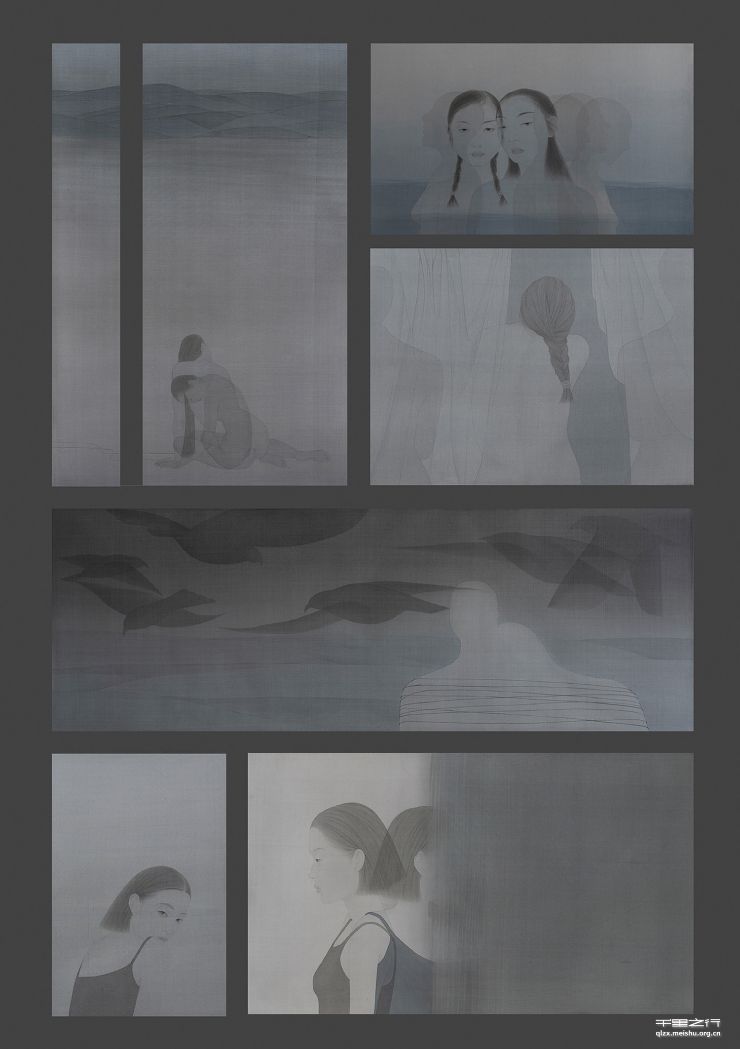 当走近徐策的作品,带给观者的是一种朦胧的诗意,拼接在一起的画面给人以扑面而来的落寞和孤寂。在创作之初和过程中间都曾和她有过交流,当作品完成时达到了预期的效果。作者以在成长过程中最真实的内心体验为出发点,把一个亦真亦幻的“我”,采用象征的手法,用形象的语言作出艺术的诠释与表达。整幅作品构思独特,设色稳重而沉静,人物塑造与画面表达相适合,具有较强的感染力!