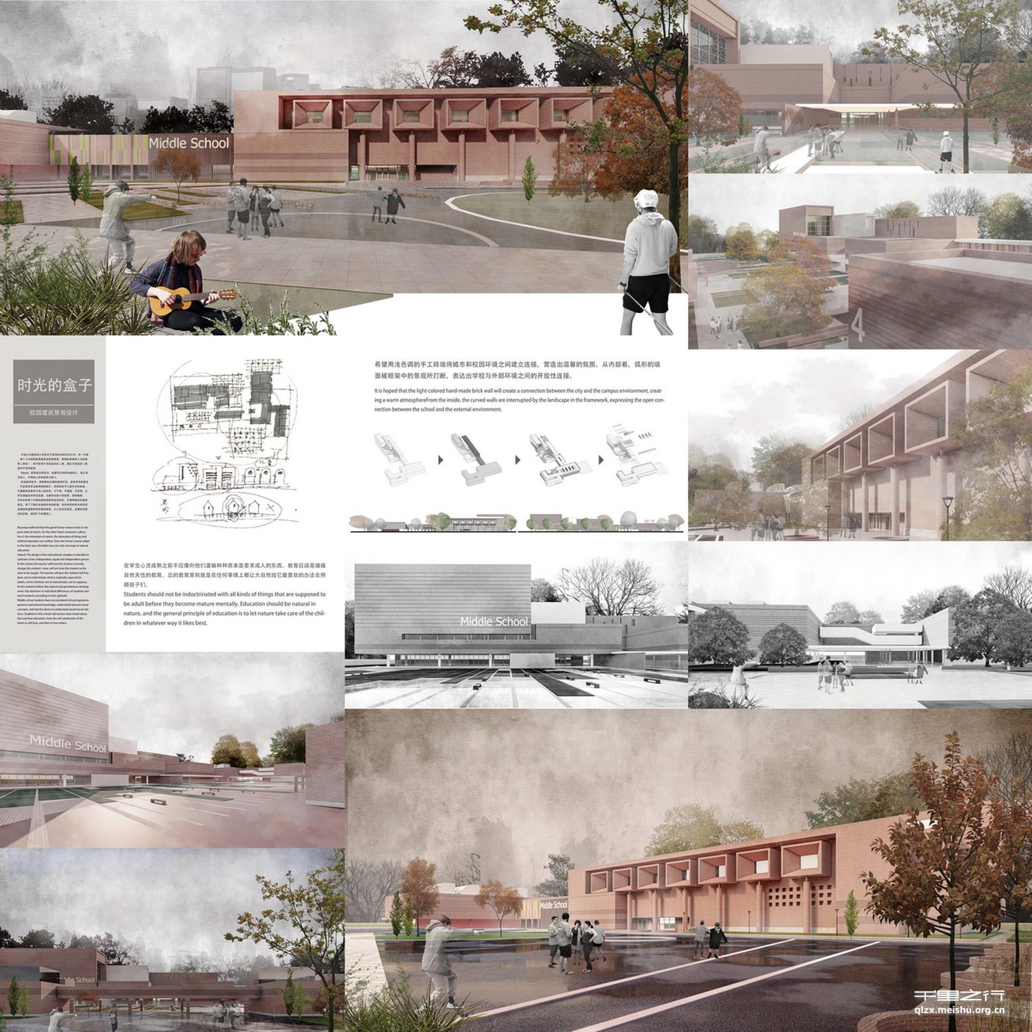 刘舸凡同学本次毕业创作,打破了原有的校园模式,从环境、景观、人文及运营等多个角度出发,通过建立线形空间轴线,标志性的符号等策略,为新的教学模式创造了一个新的空间载体。设计分为教师和学生、校园环境和城市之间的联系两个层面,用浅色调的手工砖墙营造出温馨的氛围,追求卢梭所主张的事物的教育和人为的教育二者统一。设计既是现实的,也是浪漫的,效果图表达清晰,版面设计美观,很有自己的特色和风格。