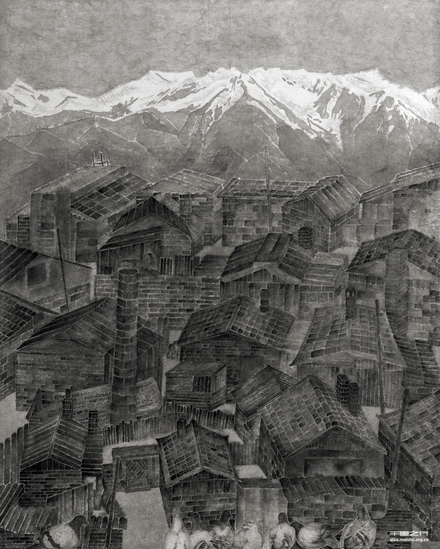我的创作是由写生升华而来的。通过在黑龙江省横道河镇的写生经历触景生情,有感而发。雪山、“空巢”、鸟禽和当地人们的善良、淳朴,以及空寂而博大的自然伟力,给我留下了刻骨铭心的记忆。远望雪山,灵光闪烁,映照在大地上的生灵,寄情于天地间圣洁之境,是我此创作意之所在。