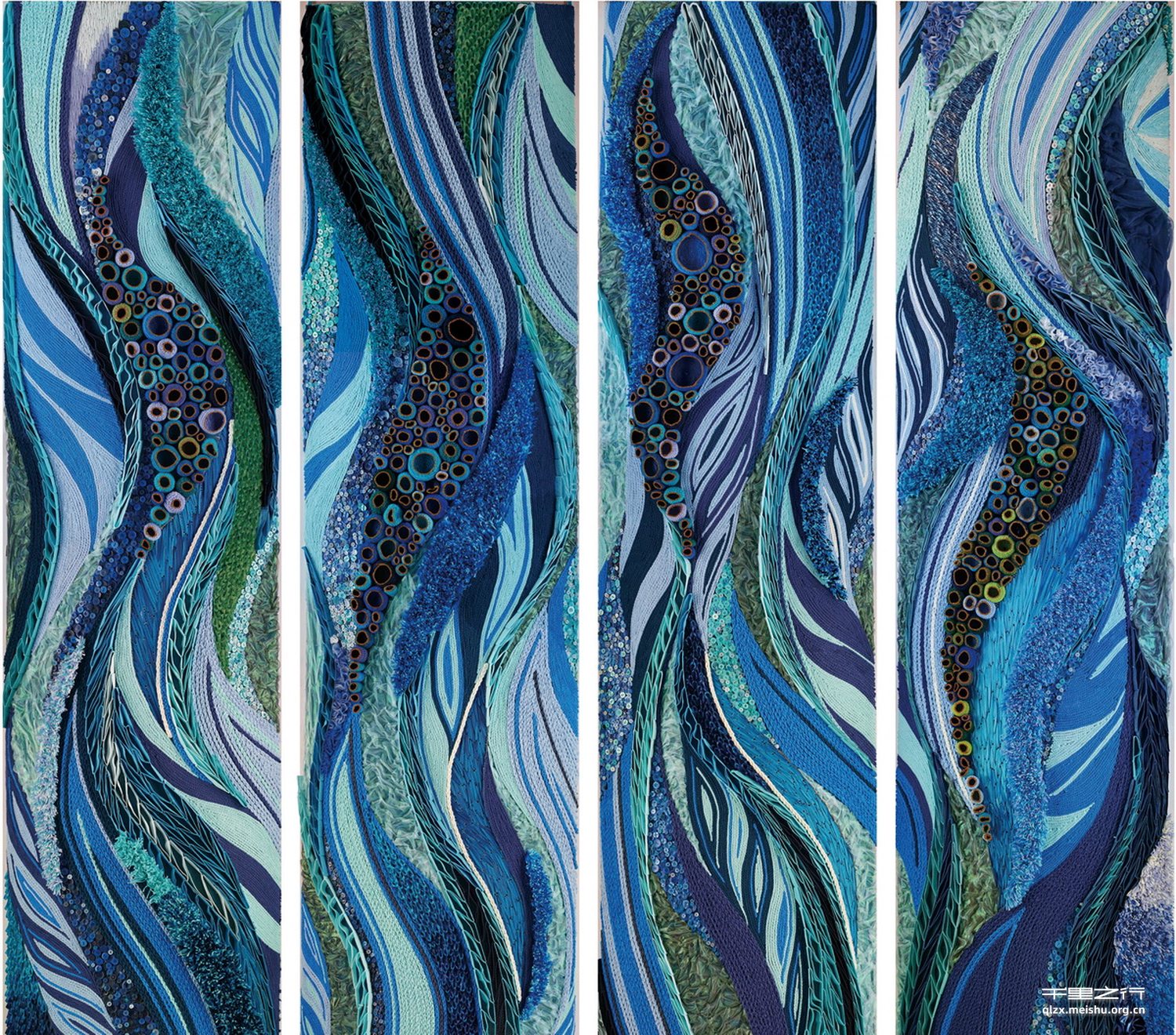 这组作品名为《爻. 蓝》。爻: 取自易经。其本义是绳结,用“爻”来命名这组作品, 是想借其结绳记事的含义,表示这组作品是我大学时期的一个节点,是一段值得记述的时间。其次“爻”还是一个象形字,有“作用相交织”的含义,就像我们纤维艺术创作中的各种技法,用交错的纤维结构来阐述自己的艺术思想和表达自己的创作情感。 蓝是这组作品的色彩基调。“爻. 蓝”----yao lan----“摇篮”,大学是我学习和成长的摇篮。