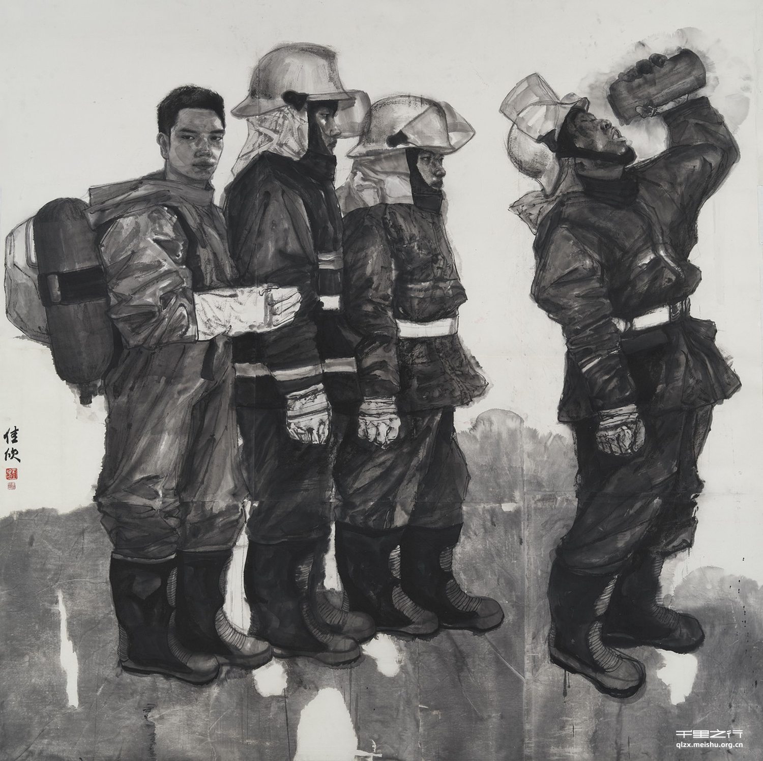 作品采用写实主义,关注现代文化与人自身的关联,从大众的生活角度出发,运用平面构成、传统的线和笔墨、西方光影的表现手法等去表现画面,表达当今90 后在努力承担起社会责任与义务和消防员这一特殊职业的艰辛。