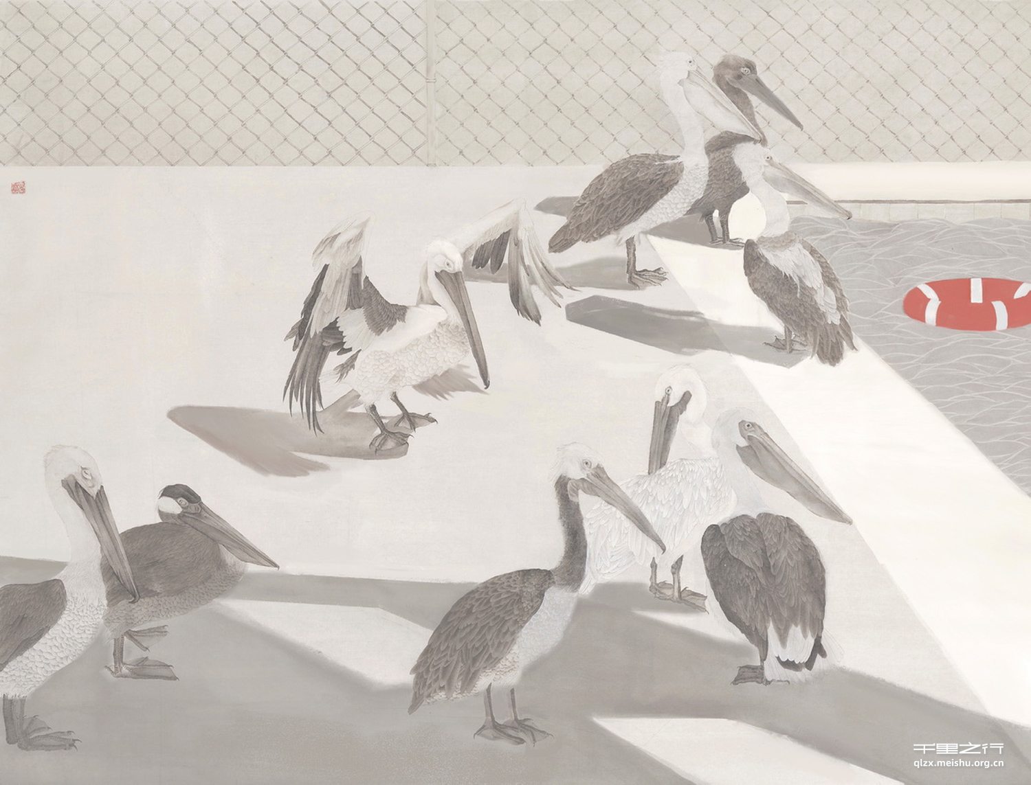 创作《边·界》选择以鹈鹕为表现对象,借鉴西方的平面构成的形式,意图构建安静平和的画面氛围,鹈鹕与人类共生在同一环境,如何理解二者的边界,构筑出一个源于现实世界的虚幻空间。我想将表达的感性情感归纳成理性、具象的绘画语言,再将其还原成最基本的感性思考与触动,传达给观者开放的视觉体验。