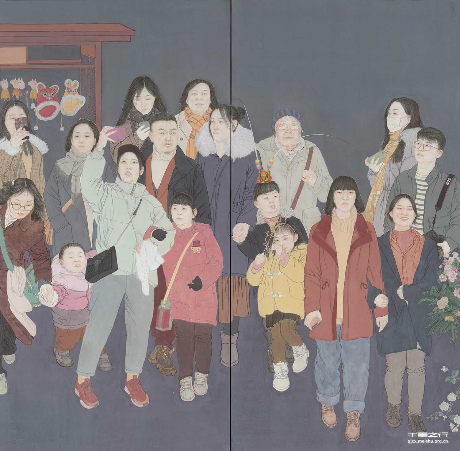 作品表现了西安不夜城人们在过年期间漫步街头的场景。画面运用散点透视方法,巧妙将人物安排在同一空间,聚散有致,构图合理,具有强烈的时代气息,孩子穿插于人物之间,既点缀画面色彩,又活跃构图内容,增加形式感,人物造型兼具表现性和主观性的表达,体现出作者较好的中国画修养和对当代绘画的理解和形式运用。