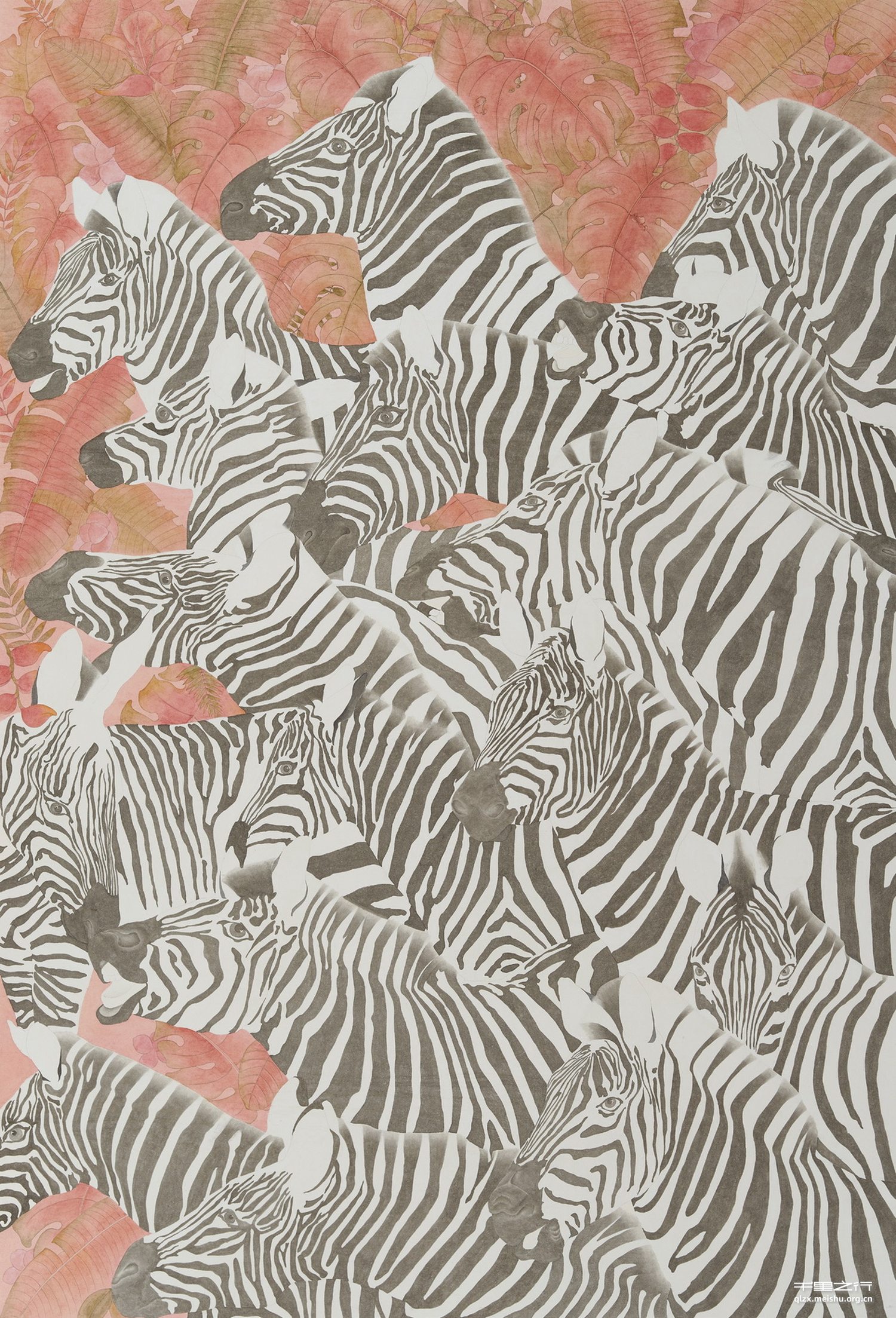 斑马为了生存不断迁徙,当具有迷惑性的斑马群闯入未曾到过的雨林,不一样的生态环境会产生怎样的碰撞。将矛盾与块面互相冲突亦互相融合,以及在异常环境下色彩之间的对抗,能否带给观者更多的趣味和想象。