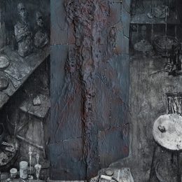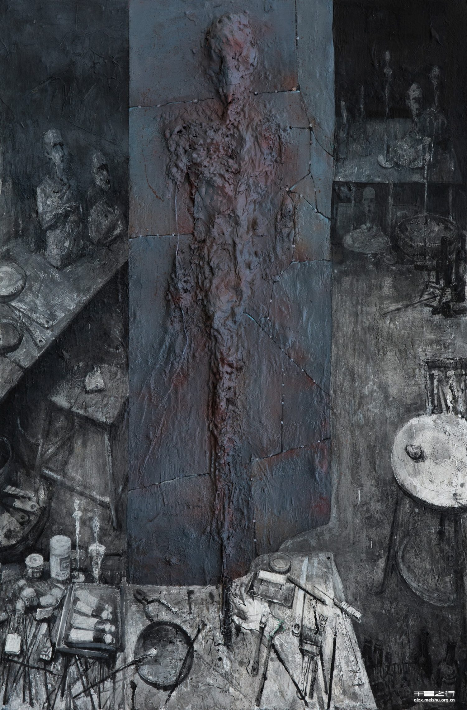 黄耿杰同学的毕业创作《工作室系列之二》,是以青年艺术家的独立思维方式,表达了对艺术产生的地方——“工作室”的深度思考和艺术想象。在作品绘制过程中的反复折腾和不断否定,也正是其艺术探索精神的精彩体现。画面张力源自于不断叠加塑造的肌理和造型,也源自于几近黑白的整体色彩演化、以及对于画面构成关系的理性思考……在生活中发现,在发现中感悟,在感悟中创造,真情实感的表达无疑是他的“工作室系列”作品的最为动人之处……
