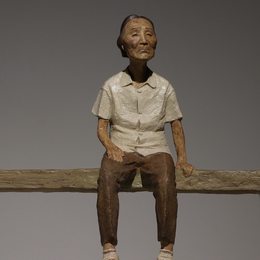 作者将关注点聚焦在当下社会的留守人群,从自己特有的视角出发,饱含着深厚的人文情感,以简练的形式语言和符号化的道具,表现了两位留守乡村的孤寡老人。作品中“无限向上延伸”的秋千绳,长的不合比例的板凳均塑造出人物内心的孤独与凄凉,这一情感与老人安详宁静的神情形成鲜明反差。作品以最精炼的雕塑语有效地触碰到了观者内心最柔软的地方, 唤起人们对社会留守的问题关注与思考,作者以“四两拨千斤”的方式表达了对一种社会问题的关切,我想,这正是该件作品的精妙之处。