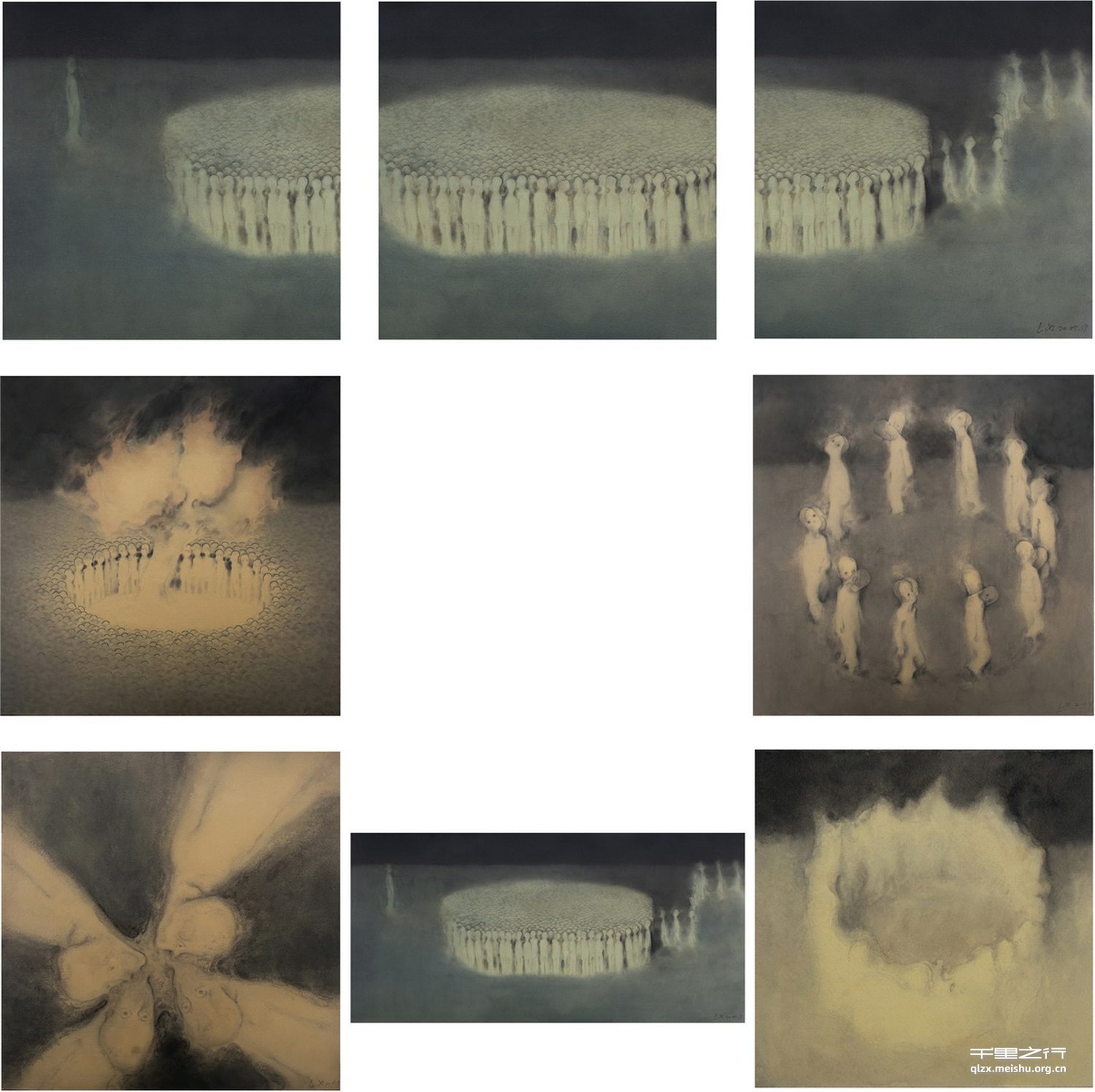 《簇拥仪式》系列完成于2020年。在作品中我想通过绘画的形式,表达自己,刨析自己,从而深入的了解自己。这些假定的人物,我想通过他们的各种行为的组合,机械化也好,神经质也罢,来表达自己大学时期内心的孤独,脆弱与伤感。人们聚在一起时谈笑散漫的姿态,会演示掉自己的一些脆弱与孤独,但它们还是会像画面左端的小人一样,存在于在这些人的内心中,会远去但不会消散;或是人们都会去相信一些东西,未知它是永恒,还是瞬间。就像一堆人围着一颗燃烧的树,它用光亮的身体吸引着人们驻足前来,但簇拥他的生物们却永远不知道他的光亮是永恒还是瞬间……