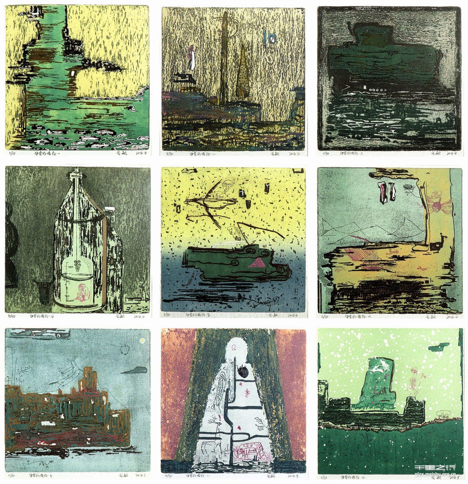 周颖的作品《伊索的指纹》系列是根据伊索的寓言故事产生的灵感而创作,但作品又不局限于故事本身,而是由故事背后自己的感受来构成画面,构图大胆,富有张力。画面是由抽象的符号组成,增加了深邃的意境。周颖利用铜版画特有的深腐蚀技法来加深铜版画特有的魅力。画面张弛有度,虚实结合,营造出很强的空间感。逐层推印出细节。画面传达了她对艺术的态度,并与观者产生共鸣。既保留了传统铜版画的韵味,又不缺乏对当下的思考。