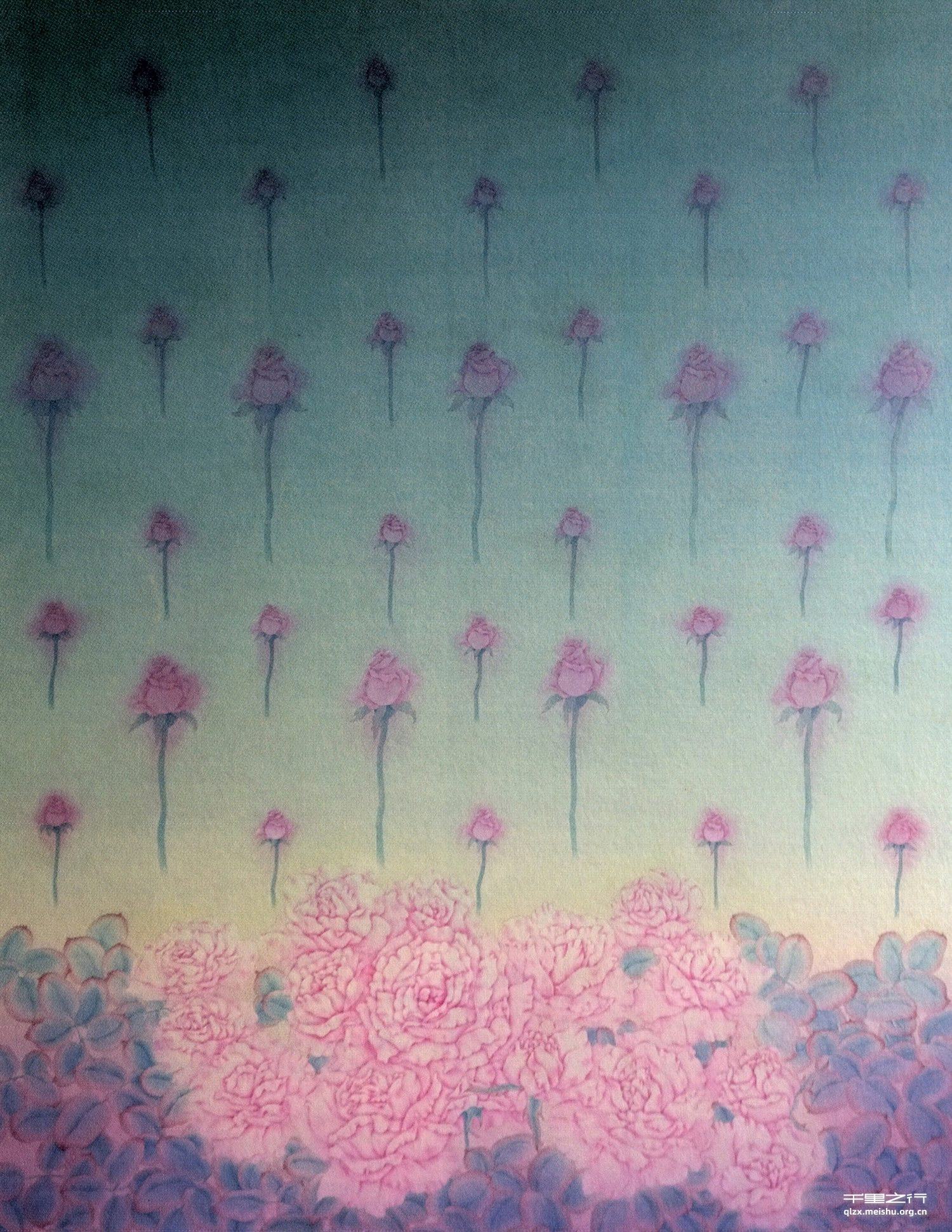 作者是女性,比较内向,鲜与生人交往,但注重自我修炼。平时课堂作业,中规中矩,画面清新淡然,朴素纯净,虽无出彩之优势,但稳中求进,思绪连连。但凡教师吩咐之事,或者她想好的作画预案,都能做得相当不错,但就是不出彩。或许这样的压力积压在她心中,甚至有时感到郁闷难解,渴望解脱但又为自已俗成的习惯所囿……《唯有时光》便是她心境的真实再现。画面上呈现出较之过去习作难有的轻盈和色彩的浪漫,玫瑰色的基调中随风升腾的花朵终于挣脱了枝蔓的挂靠,自由地、优雅地飞向天空……用现代工笔画的形式语言、言简意赅的主题刻画方式传达出意境,是这幅作品的可取之处。
