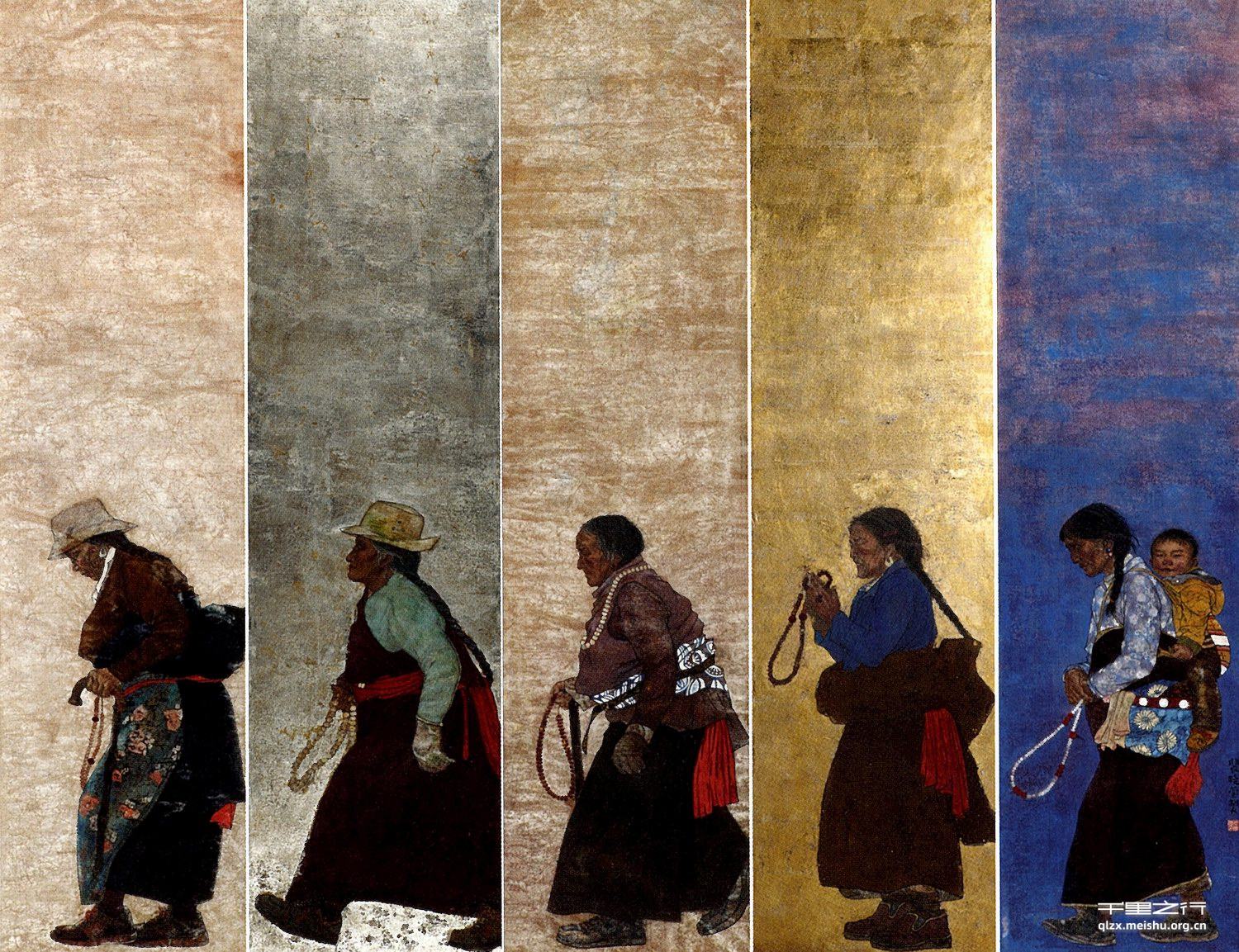 为了表现朝拜者在朝圣途中所经历的种种磨难,所以我选择朝圣途中不同的场景去描绘。为了让其更具有诗意性,将整体构图分割成条屏状,形成一种秩序感,给人以焕然一新的感觉。在下方画入主体物,深入刻画人物,突出人物的精神状态。在人物的处理上,我有意夸张了其形体,使其更显敦厚,表现出藏民的豪爽不羁。对于背景的处理比较意象,使其能给人以想像的空间。