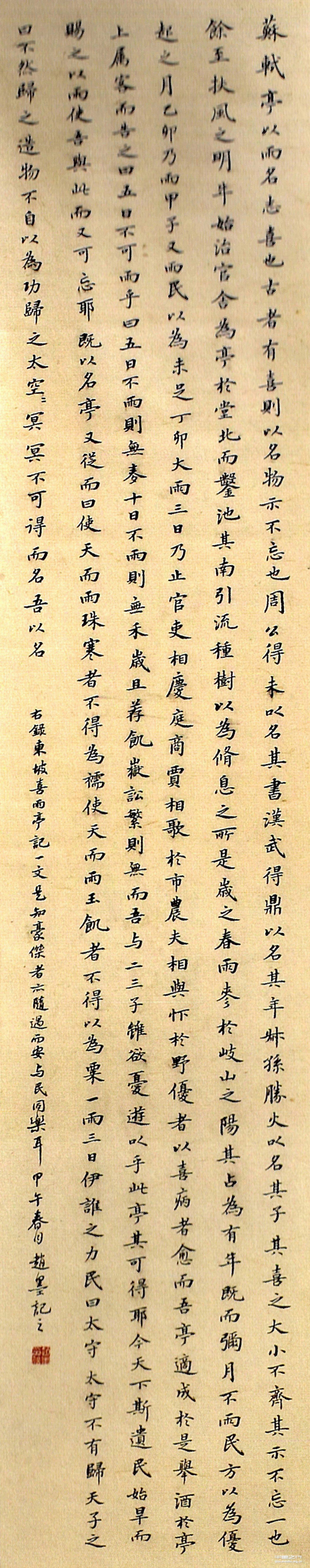 —直以来倾心于东坡先生的《喜雨亭记》,因此就有了她的这幅创作。作者以智永《真草千字文》楷书部分为创作基调,并糅以钟繇小楷笔意。注重书写过程中行书意蕴的表达,使得单字紧密而不失灵动,通篇虚实相生。可谓神完气足,书风俊秀,与文章亦相得益彰。