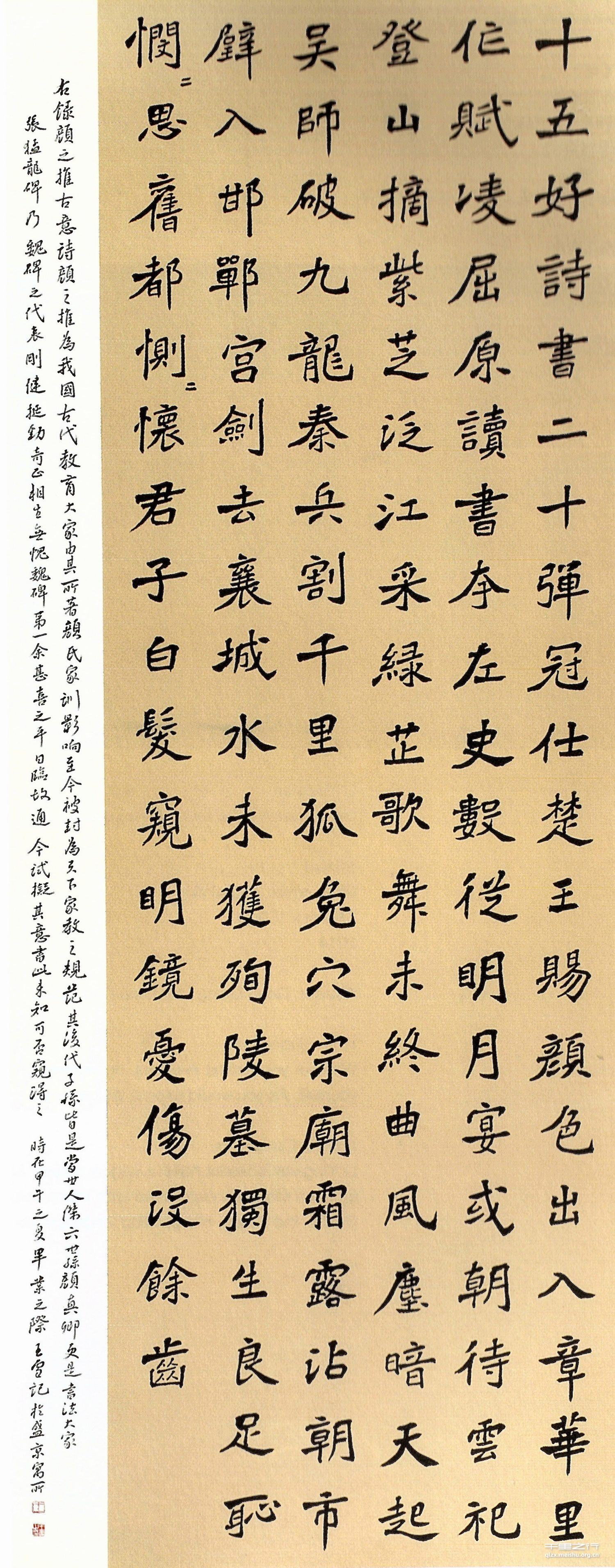 通篇字形大小由之,力求将自然的书写与碑刻的庄严整殇之气象相融合,并运用墨色,体势的欹侧变化与整体虚实对比等手段,以增强作品的视觉效果,造就了轻松自然的整体面貌。
