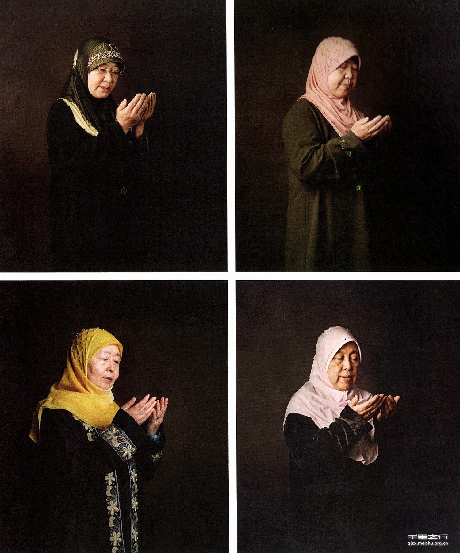 穆斯林妇女身穿传统衣服和戴盖头,感觉到自身的尊严和高贵,为自己是穆斯林而感到骄傲。她们所表现的是贤淑和庄重的人格。通过穆斯林妇女的衣着与手势,伊斯兰教对肖像的禁忌,表达个体生命对艺术的迫求.,