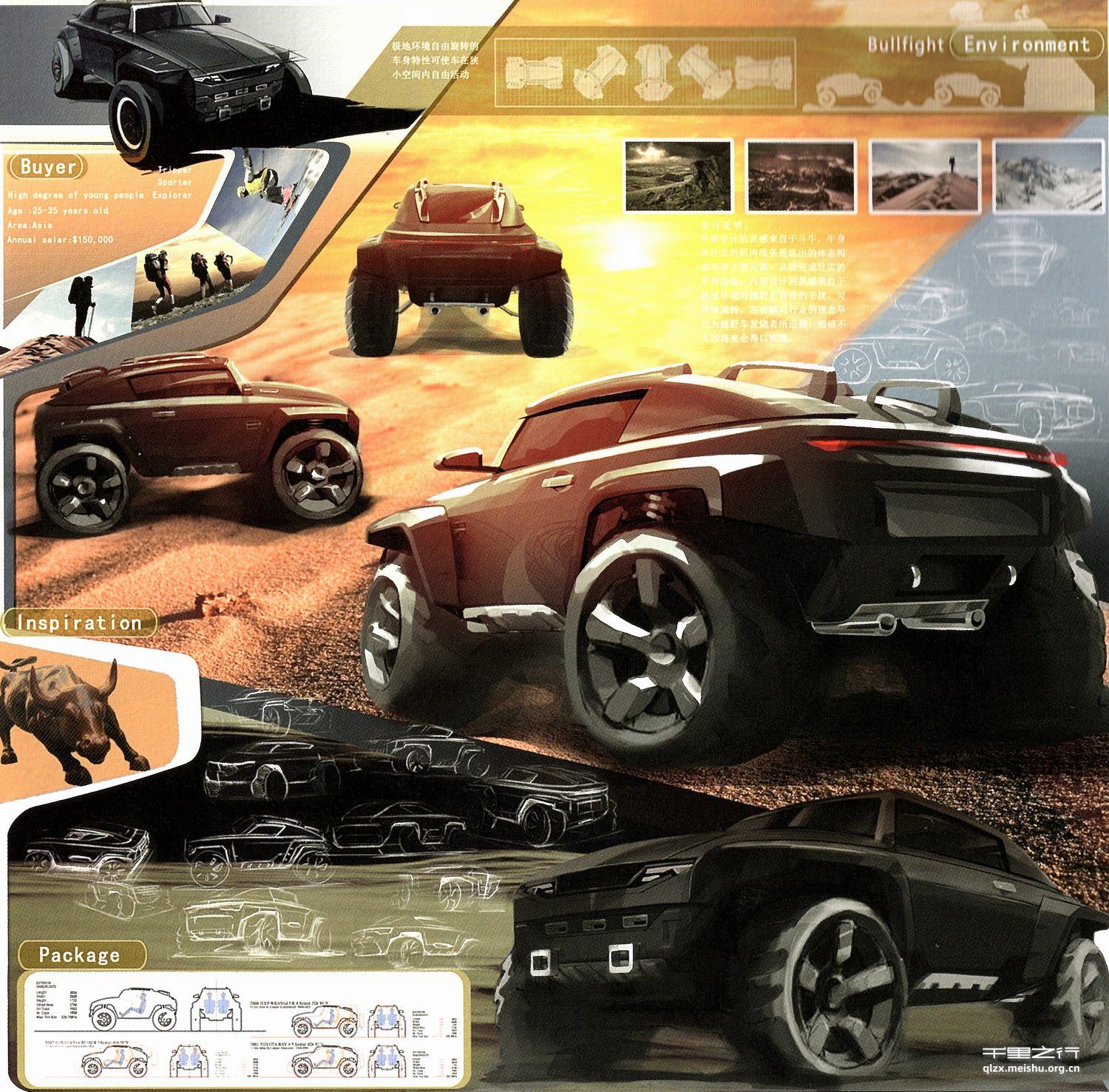 外部设计的灵感来自于斗牛。牛身体壮实的肌肉线条提炼出的体态构成车身主要元素,从而完成壮实的车身造型。内部设计的灵感来自于极地坏境对越野车自身的干扰。可原地旋转、左右横向行走的理念早已为越野车发烧者所追捧。相信不久的将来会得以实现。