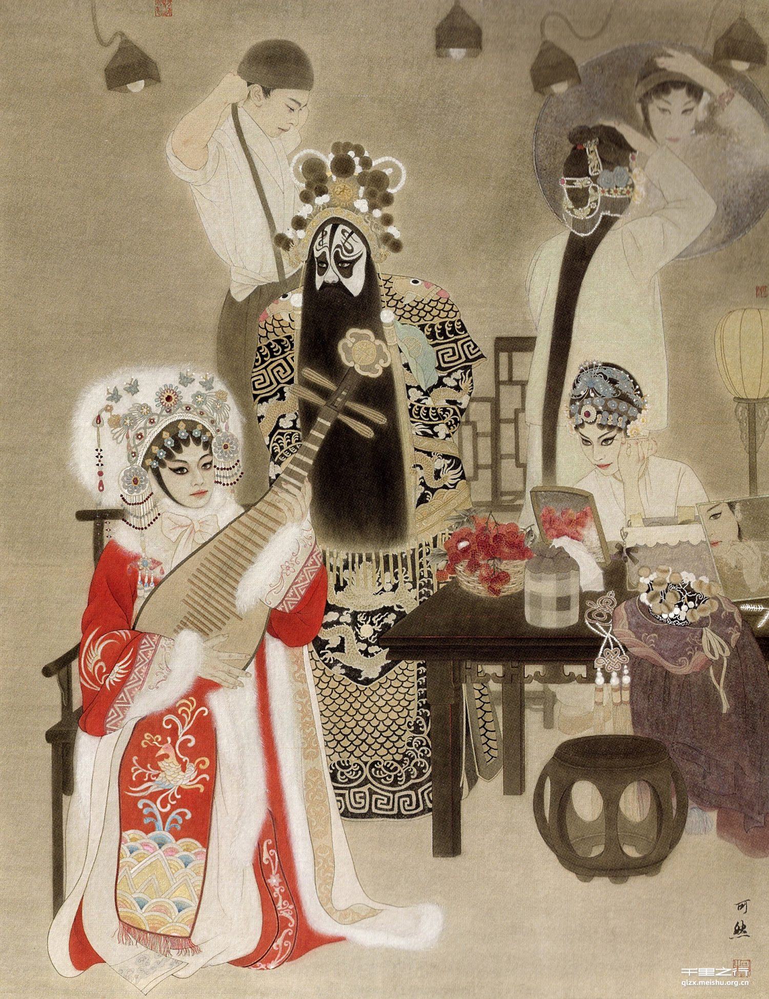 陈婷婷的作品《南国荔枝香》,以岭南文化为背景,广东粤剧题材,从后台的角度描绘生旦净丑的形形色色。画面色调怀旧,以黑色块面和线条切割画面,形式感强,勾线和设色技法运用得当,色彩处理明朗大方而不失精致的细节刻画,是一幅优秀的本科毕业创作作品。