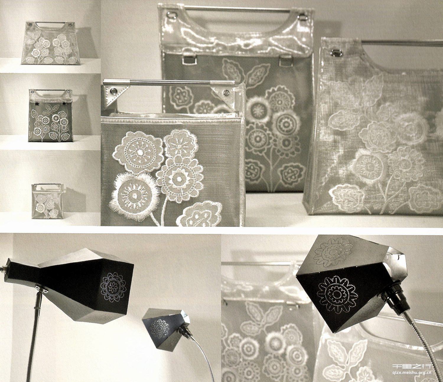 本案的创新之处在于材料和工艺的创新组合,将电脑绣花生产工艺应用在钢丝网纱和PVC材料上。在强烈的金属感的基材上用平绣单针、挨针表现秀美的花朵图案,在PVC材料上走空针轧出孔洞,使光线在绣花的洞孔中透出花形。作品总体的视觉效果和实用性都较好,体现出产品的艺术效果,又可以实现工艺的批量化生产,是一组体现艺术与现代生产技术结合的优秀设计作品。