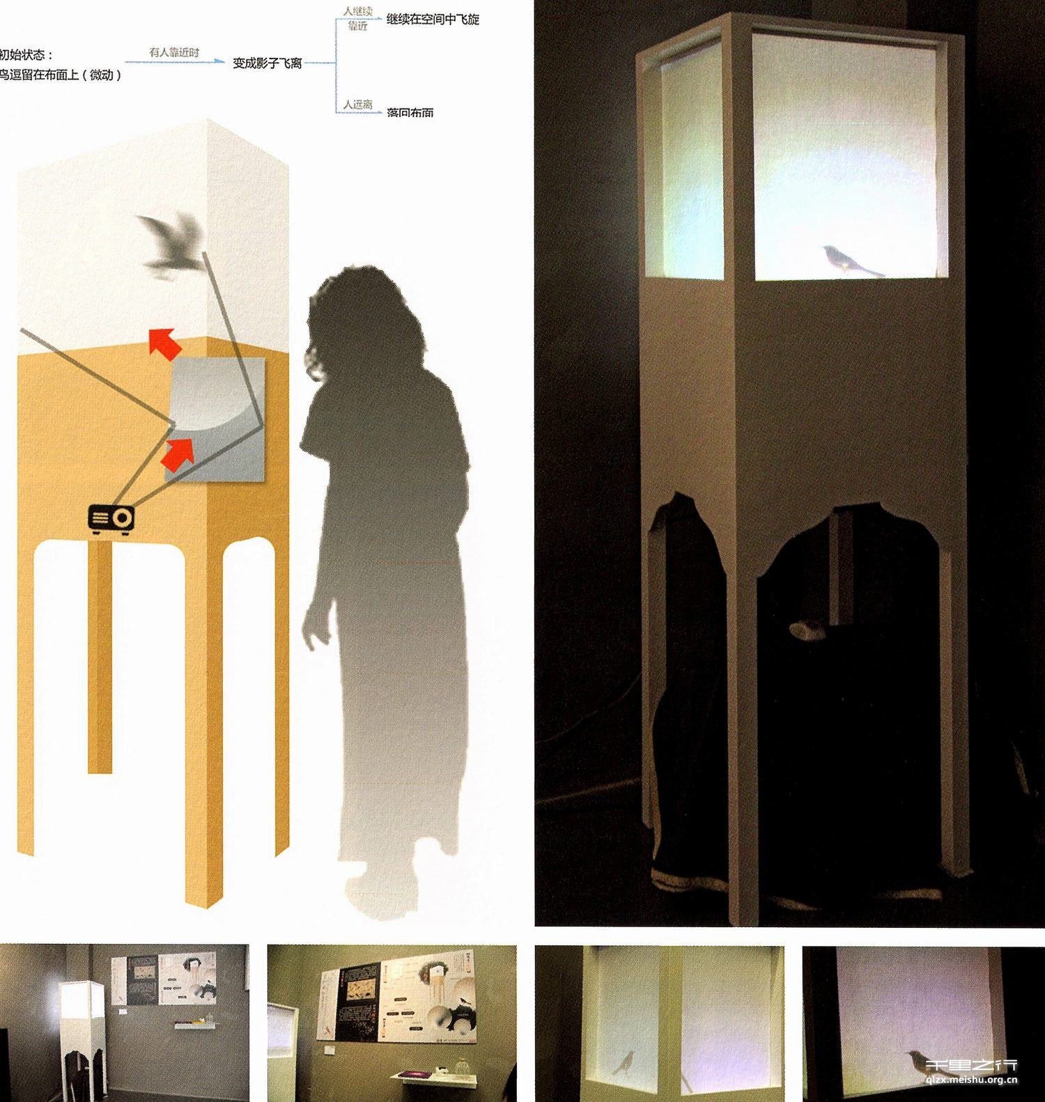 杨也的毕业设计是一次综合了多种技术和媒介的尝试,包括了:装置的艺术设计、投影技术、传感技术、动物模拟以及影片的调度设计。此作品巧妙地运用“皮影”的光影效果,营造了栩栩如生的“鸟与笼”。该作品从设计创意到技术实现都比较成熟,观众体验反馈较好。