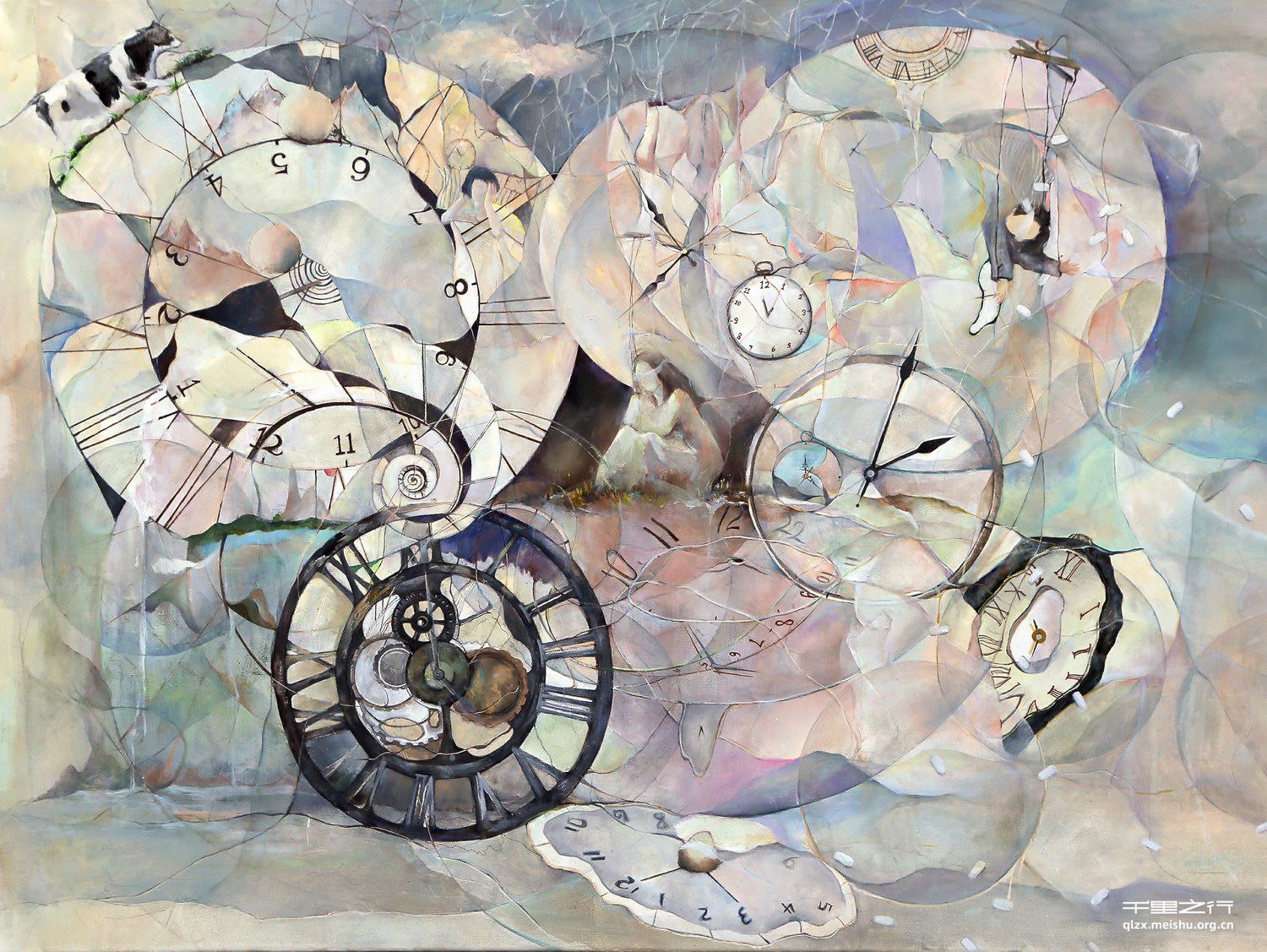 因为失眠产生的焦虑,给我的感受就好像时间被定格了,被困在一个时间维度里无法挣脱。似乎生活就像一团乱线。而达利作品中出现的时钟意象给了我创作思路,生活也是个怪圈,创作的时候感叹如果能抓住浪费的时间就好了。
