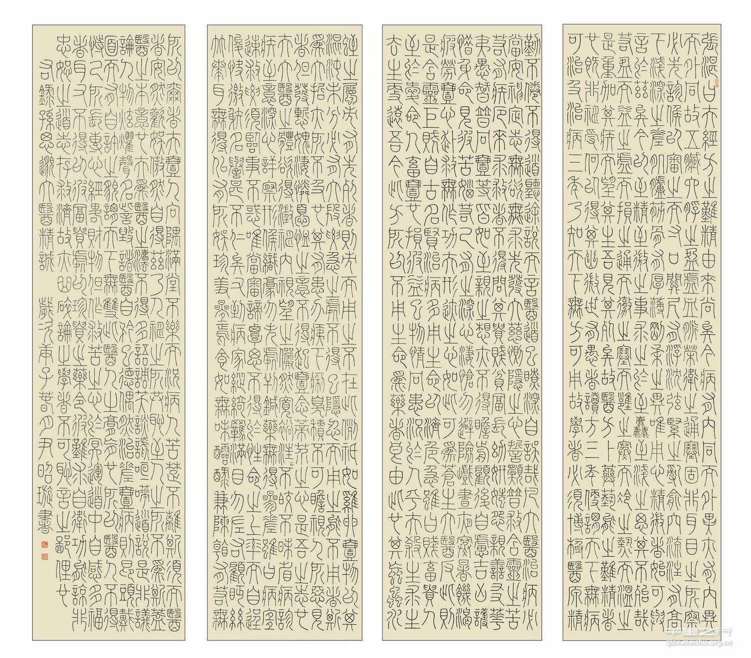 我的这件篆书创作《大医精诚》意在致敬伟大的白衣战士。其文情深意切,稳重质朴,无华丽之词藻,唯赤诚之仁心。以篆书创作,方得文质彬彬之妙。试将秦李斯、唐李阳冰及清王澍等人的“玉箸篆”进行融合运用,以期获得满意效果。创作时力求笔画均匀平和,结体庄重沉稳。在完成如此大幅作品创作中,出现了不同风格不协调的问题,经教师们悉心指点,又经多次创作磨炼,对于“玉箸篆”有了更深刻的理解,积累了创作经验,获益颇丰。