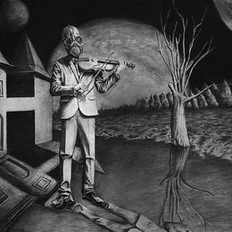 我们日常的生活就像是一首优美的乐曲,而我们就是这乐曲的谱写者和演奏者,因此我选取了这一形象。至于为何要戴着防毒面罩,其实在我们的生活中我们有必要的会对一些事物进行隔离,在通过不断地试探和研究及经过一系列的准备后,我们会一步步的去解除对于它的隔离,去接受它;相反,当一个事物对于我们有威胁时我们也会一步一步的去隔离它,直到我们不在受其影响。随着科技的不断发展,人们的交流也就越发的方便与频繁,出行也就越发的便捷。可是大多数的时候我们都会想一个人静一静,去思考一下在学习中的所思所得,和朋友去趣谈中的收获等;其实更多的时候是让自己天马行空的想象力的到发展,正如《隔离的演奏-1》中所表现的独奏一般。