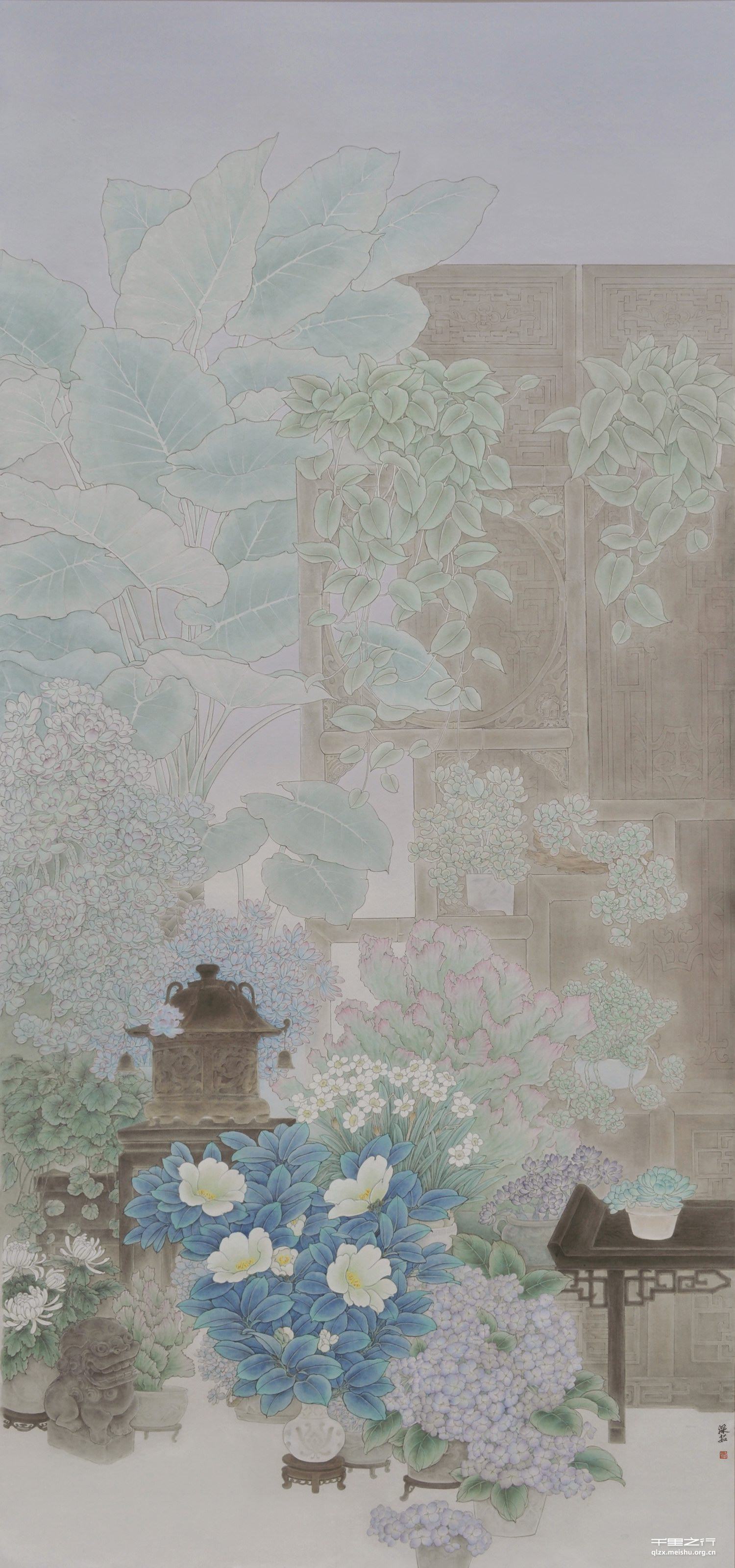 毛深茹的作品《椿舍》画面呈现出繁而不乱的秩序感,寻常小店中的盆花鳞次栉比,错落有致,于平常景象中娓娓道来。创作者以宋画之精神,将充满诗意的饱满情感慢慢灌注于笔笔分染之中,在冗长的工笔创作中一直保持敏感的内在触觉。全画技法朴素,染法细腻雅正,对每一个细节的关照及整体气息的把握都比较到位。该生对对虚实关系的控制能力亦可圈可点,纷杂的物像被提炼得明练、单纯而有序,通过虚实互生的手段将平面中的不同层次关系处理得恰到好处,整体画面以虚统实,在古韵中却又生机黯然,静谧里言说着心中平和的性灵之美。