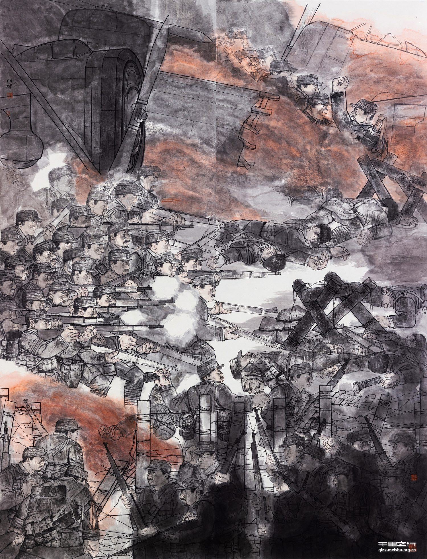 方明锋同学的本科毕业创作《夜袭阳明堡》,取材于八路军夜袭阳明堡的战役。1937年秋八路军为配合正面战场的忻口战役,在山西代县阳明堡发动夜袭,成功炸毁日军一个飞机场。作品通过较宏大的场面布置,运用勾勒、皴擦、泼墨、破墨等综合水墨技巧,营造出紧凑、激烈的战斗氛围,人物造型生动有趣而不脱离现实感受,整体上具有较强的艺术表现力和视觉力量。该作品是近年本科人物画毕业创作中较为少见的、值得鼓励的主题性创作。