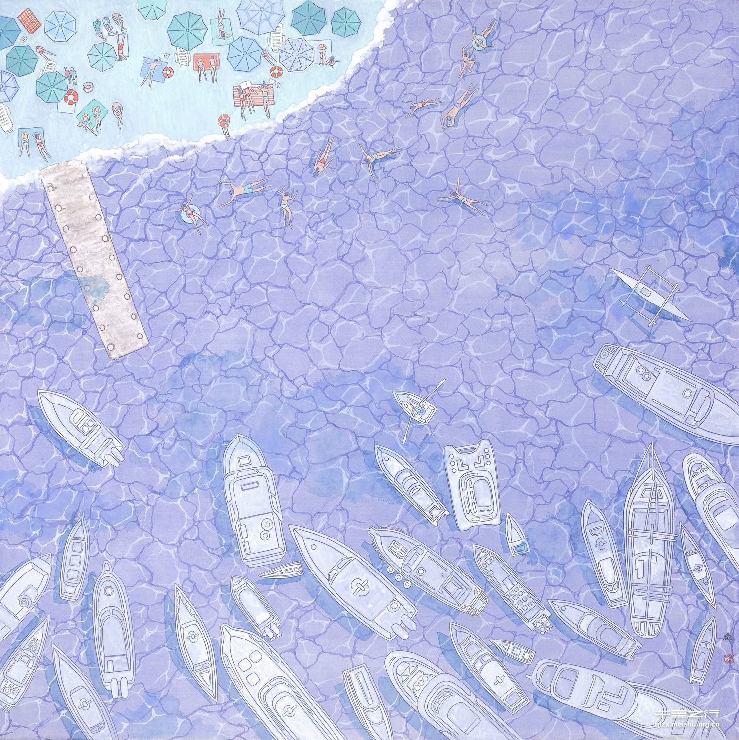 李思睿的作品《浴风海栖》呈现一种欢愉的视觉感受,九零后的她没有沉重的历史包袱,创作来源于下乡的一种感受。感受并非都是一种沉重,九零后自有其视觉的截取范畴与兴奋点,这也是一种极为真实的反映,弥足珍贵。蓝天、大海、游艇、闲客,这都是当时的印记,没有多余的顾虑,没有虚伪的呻吟,只有自己的所察,真实得只有蓝天澄澈的充满。此刻,技术已经不再是评价的标准,投入画面内的海水蓝天,享受那种夏日欢畅才是作品的感人所在……