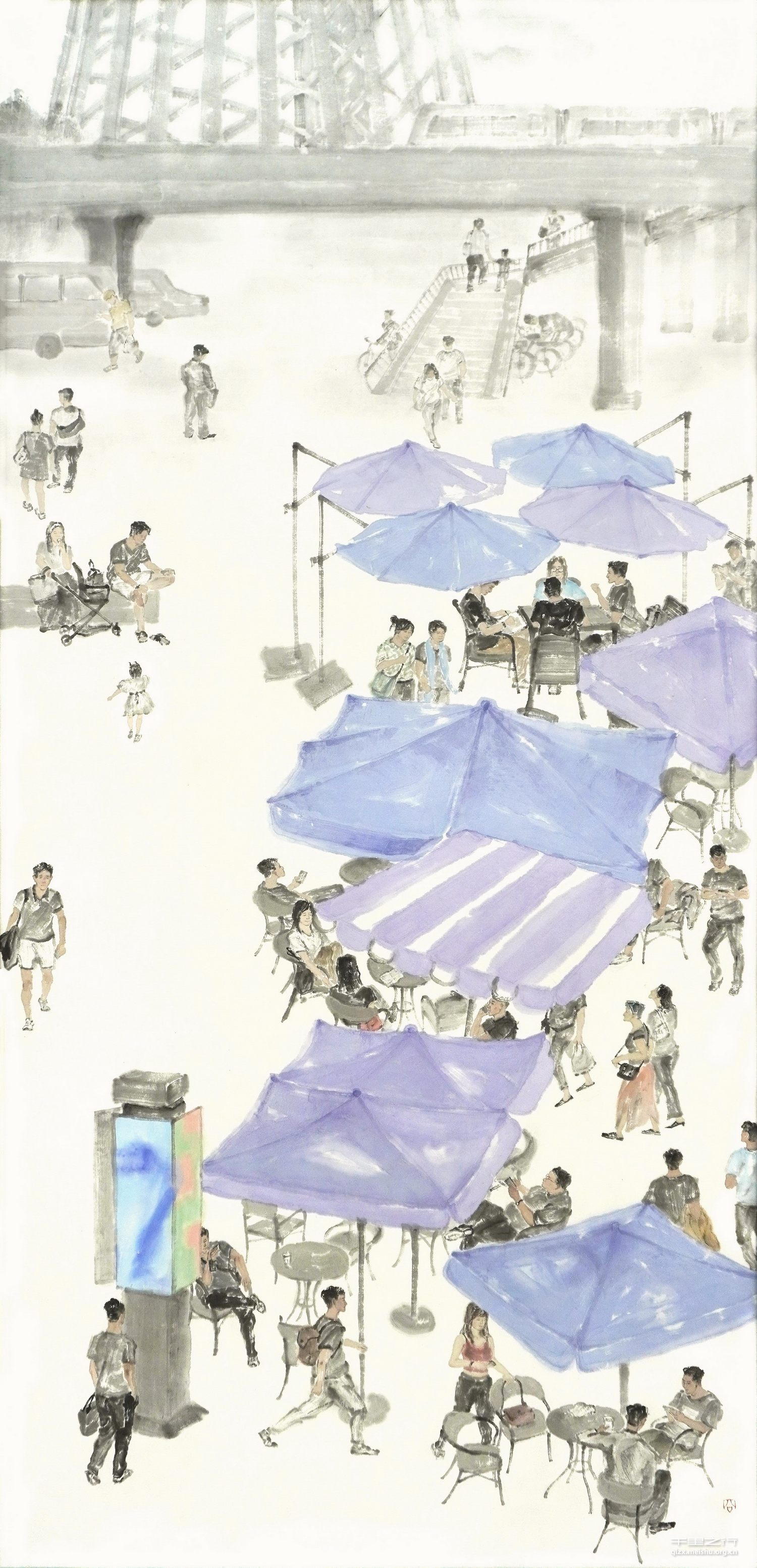 “Recreation” belongs to the city ink figure painting, depicting the lives of Guangzhou tower in the“Little People”, people or a short rest, or hurried to and fro, where the“Little people” has two meanings, one is in the painting of a smaller proportion of the size, the second is small identity. In terms of composition, there is a sense of contrast and composition. The main color of the picture is grey ink, with a solid-colored parasol as the highlight. The remaining large area of white space makes the picture more pure and lively, and then through the desalination of indoor and outdoor space and occlusion so that the screen expression more unified and simplified, the plot more diverse.