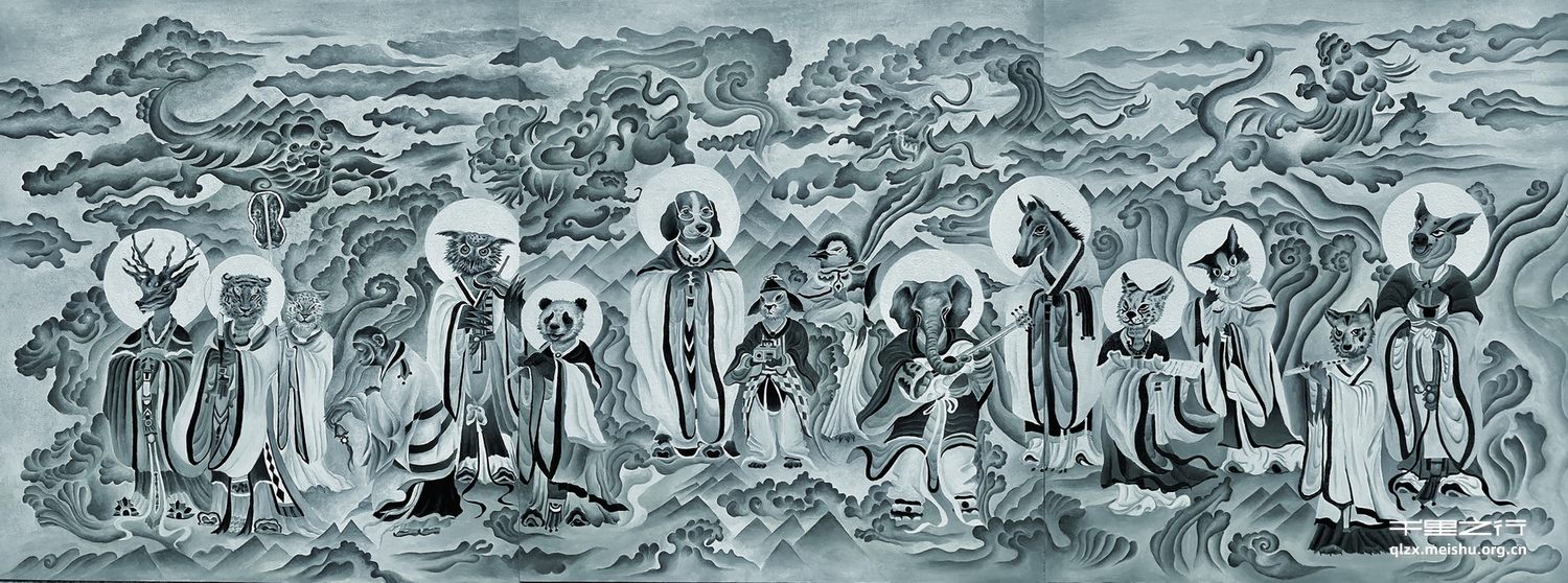 The inspiration for this work "Paradise" comes from the "Twenty Heavens" depicted in the picture of the Emperor Shah Brahma in the frescoes of Fahai Temple in the Ming Dynasty. The characters in the original murals are soft and friendly, close to reality, showing the style of heaven and earth. I think that there may be many worlds above the clouds that we have not known about. They have different postures and species, and they also show many interesting small scenes on the journey of Xian Li and Buddha. Through the interpretation of the original murals, combined with personal schema language expression, I only present my imagination of Cloud Paradise with one stroke and one stroke.
