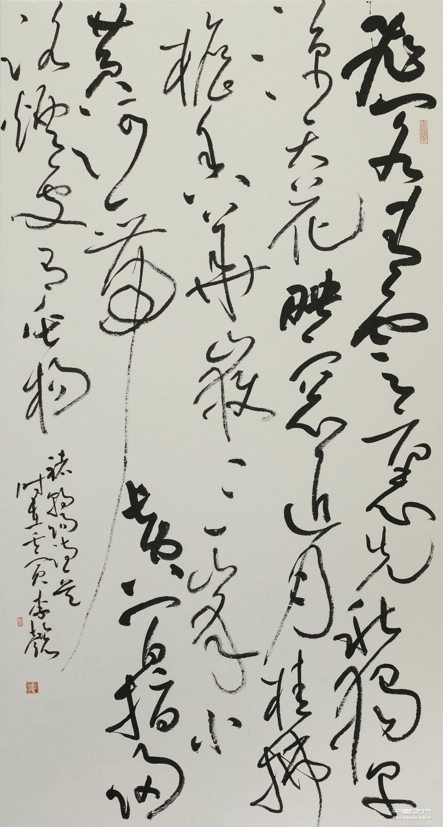 This piece of big grass works is based on huaisu, which can not only see the temperament in the fast movement, but also maintain a high precision of techniques. The author has a strong sense of creation, and the transformation from cursive classics to modern creation is relatively smooth. The works pay more attention to the visual effect of the exhibition, reflecting a good control of the format and performance ability.
