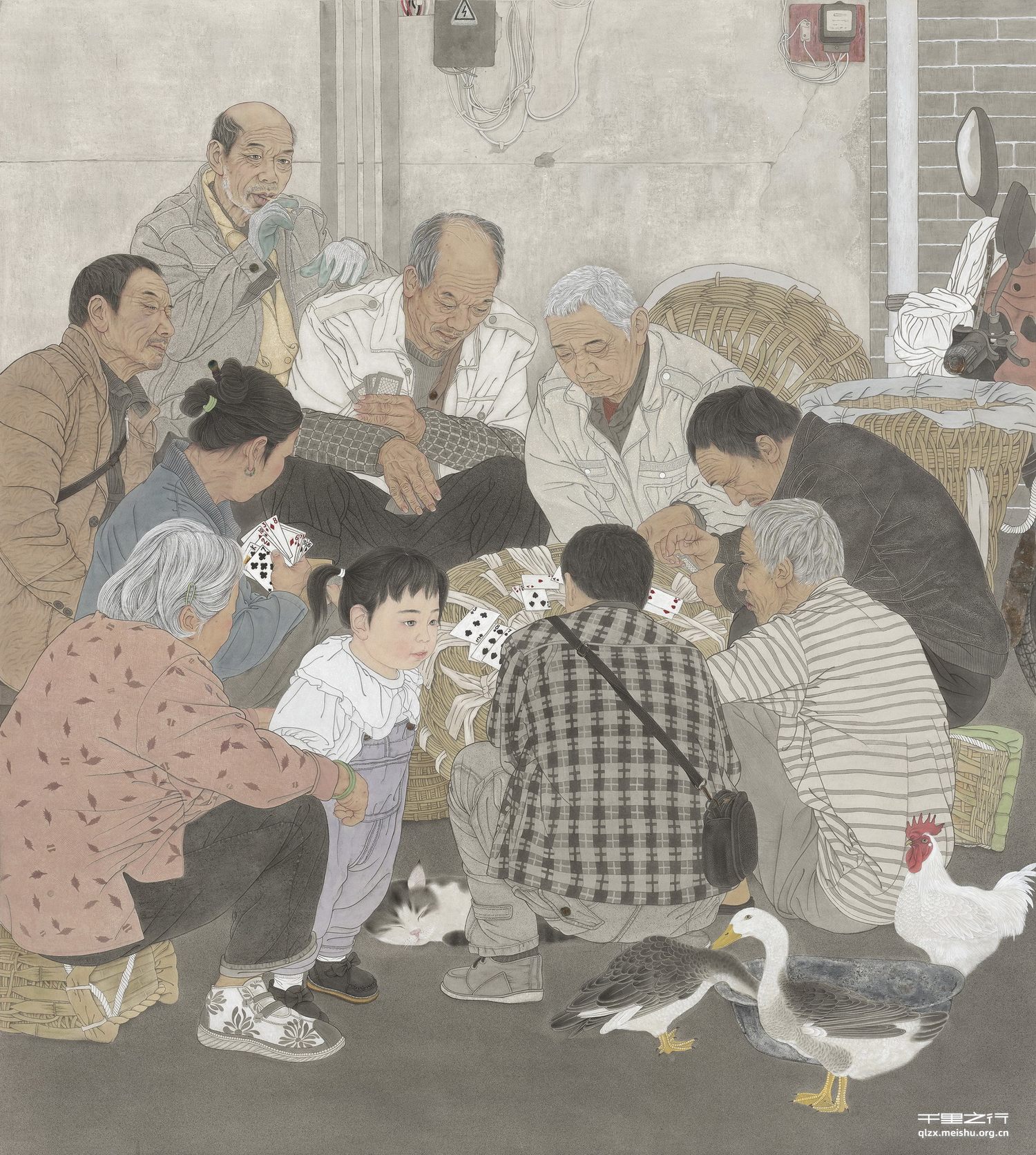 "Leisure Afternoon", 200cm x180cm, the work focuses on the comfortable and leisurely life scene of the old farmers in Bayu playing cards in their spare time in the new era of "well-off society for all". It reflects the happy life of the old farmers, connects hard work and indifference, connects the spirit and life, and projects revitalization and hope. The composition of the picture is unique, the natural integration of characters and scenes, rich in strong visual impact. The production adopts traditional meticulous techniques, precise and delicate, and the micro expression of characters is vivid, so that the work not only has the traditional charm of god beauty, but also rich in contemporary visual impact.