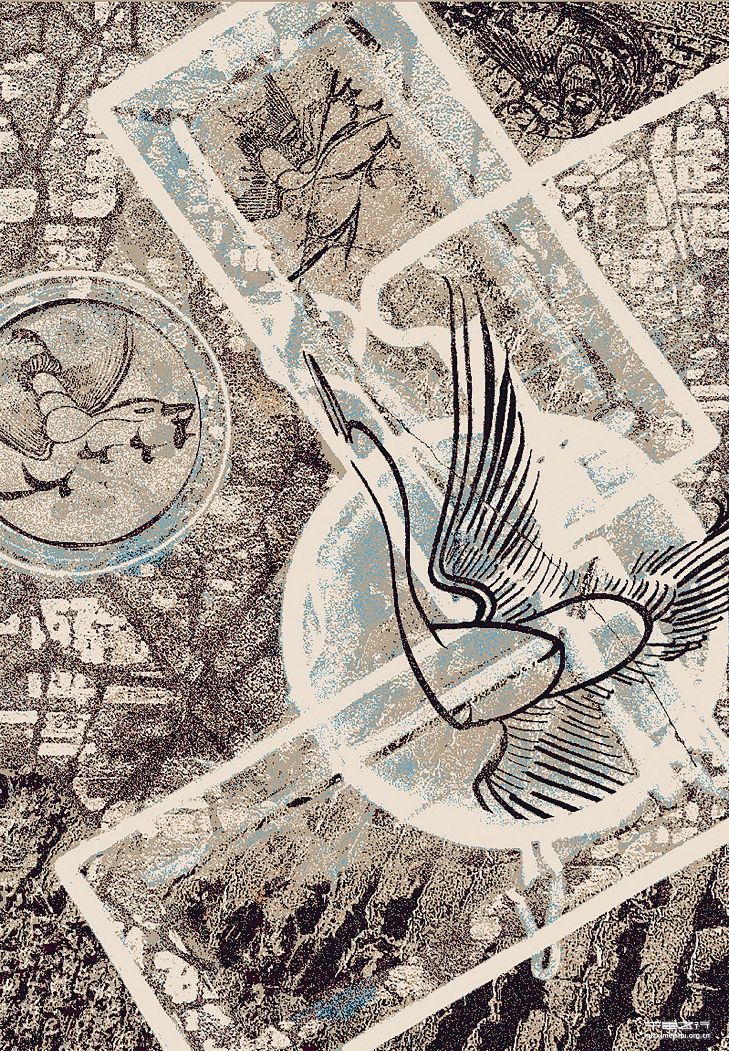 The carpet design uses the outline of birds, stone roads and geometric pattern elements on the porcelain. The patterns on the bottom layer are made of stone roads and broken land. On the second layer, geometric patterns are used as the segmentation of the picture, with linear birds as the main body. On the bottom layer, surfaces are used, and lines are used as the main body. On the second layer, points of abstract words are used. The design language of points, lines and surfaces enriches the picture. The overall tone is mainly earthy yellow, and black and white have a strong contrast effect. It expresses that the traditional Chinese porcelain patterns are closely related to the land of China, and breed excellent culture in the high-quality land.