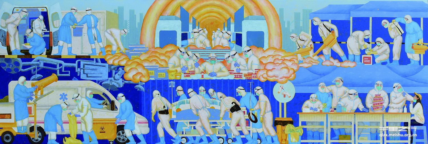 杨馨的作品《众志成城》,题材源自新冠疫情暴发,描绘全体医护人员奋力投身抗疫与消杀。作品以壁画的形式展开、以蓝白的基调营造气氛、以全景式的展现方式;画面强化图像化意识,形式感与构成意识,对人物与景物的典型化形象处理,也使抗疫过程紧张有序。